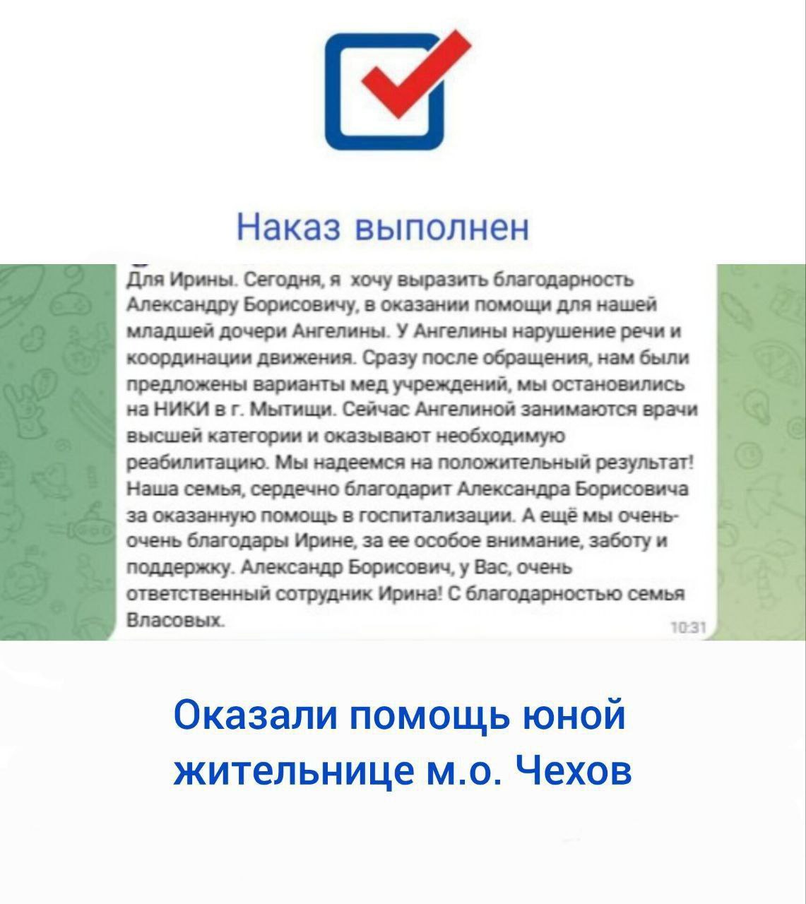 В ноябре ко мне на личном приеме в Чехове обратилась мама с дочкой, которой долго не могли поставить диагноз. Сегодня девочка госпитализирована в ведущий институт детства и проходит комплексное обследование. Это и есть суть нашей работы - видеть проблему человека и вести ее до результата.