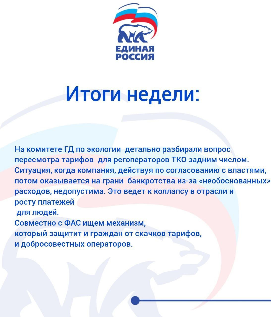 На комитете ГД по экологии детально разбирали вопрос пересмотра тарифов для регоператоров ТКО задним числом. Ситуация, когда компания, действуя по согласованию с властями, потом оказывается на грани банкротства из-за «необоснованных» расходов, недопустима. Это ведет к коллапсу в отрасли и росту платежей для людей. Совместно с ФАС ищем механизм, который защитит и граждан от скачков тарифов, и добросовестных операторов.
