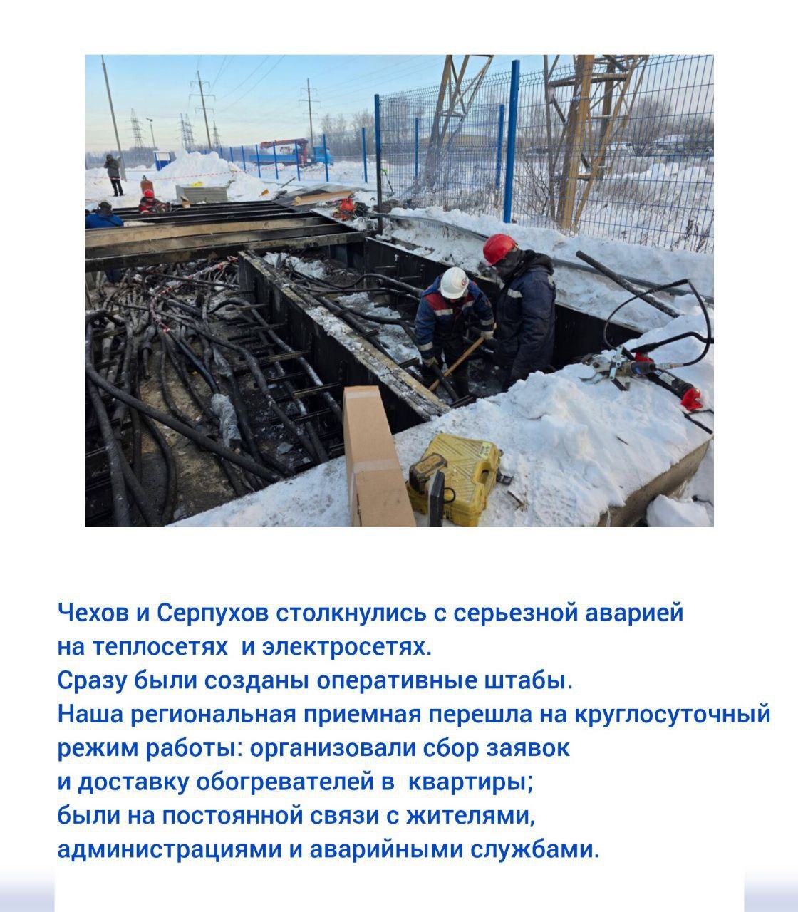 Чехов и Серпухов столкнулись с серьезной аварией на теплосетях и электросетях. Сразу были созданы оперативные штабы. Наша региональная приемная перешла на круглосуточный режим работы: организовали сбор заявок и доставку обогревателей в квартиры; были на постоянной связи с жителями, администрациями и аварийными службами.