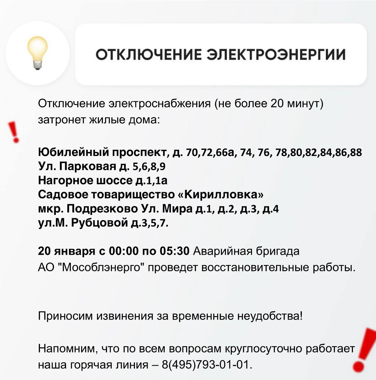 Информацию о работе ресурсоснабжающей организации можно получить по номеру горячей линии: +7 495-793-01-01.
