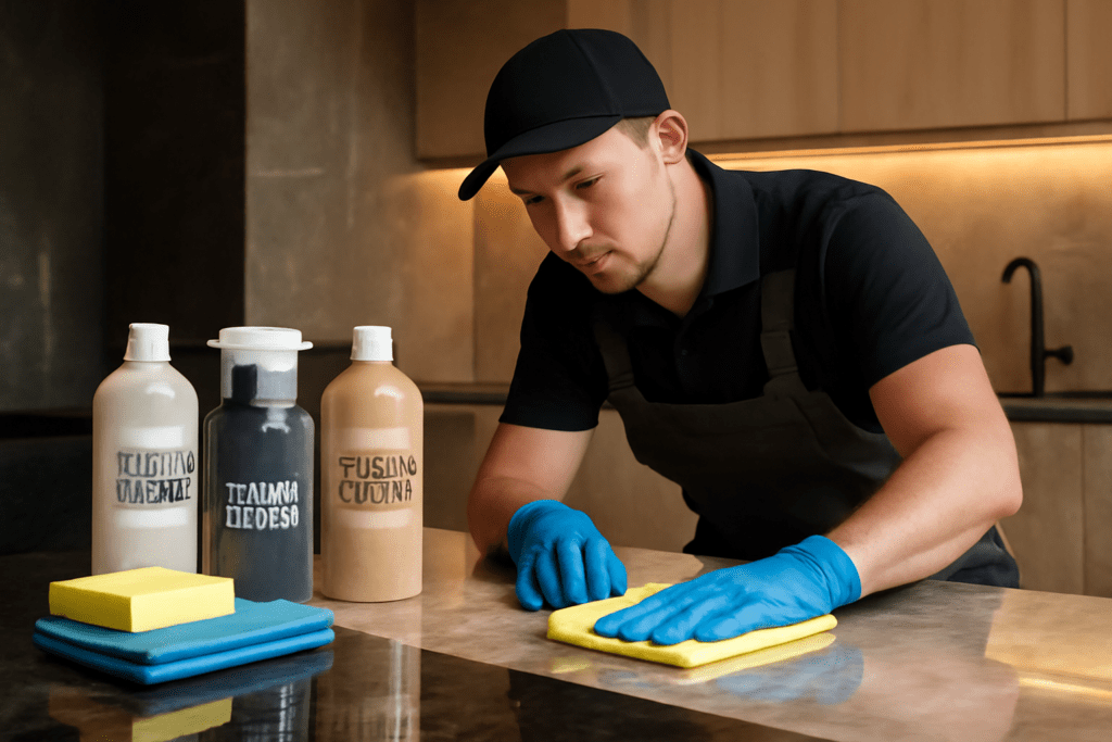 Для простого и быстрого ухода за камнем следует удалить пыль и песок с помощью мягкой щётки или пылесоса с нежной насадкой. Затем стоит обработать поверхность влажной микрофиброй с теплой водой и не забыть пройтись сухой тканью — это предотвратит появление разводов.