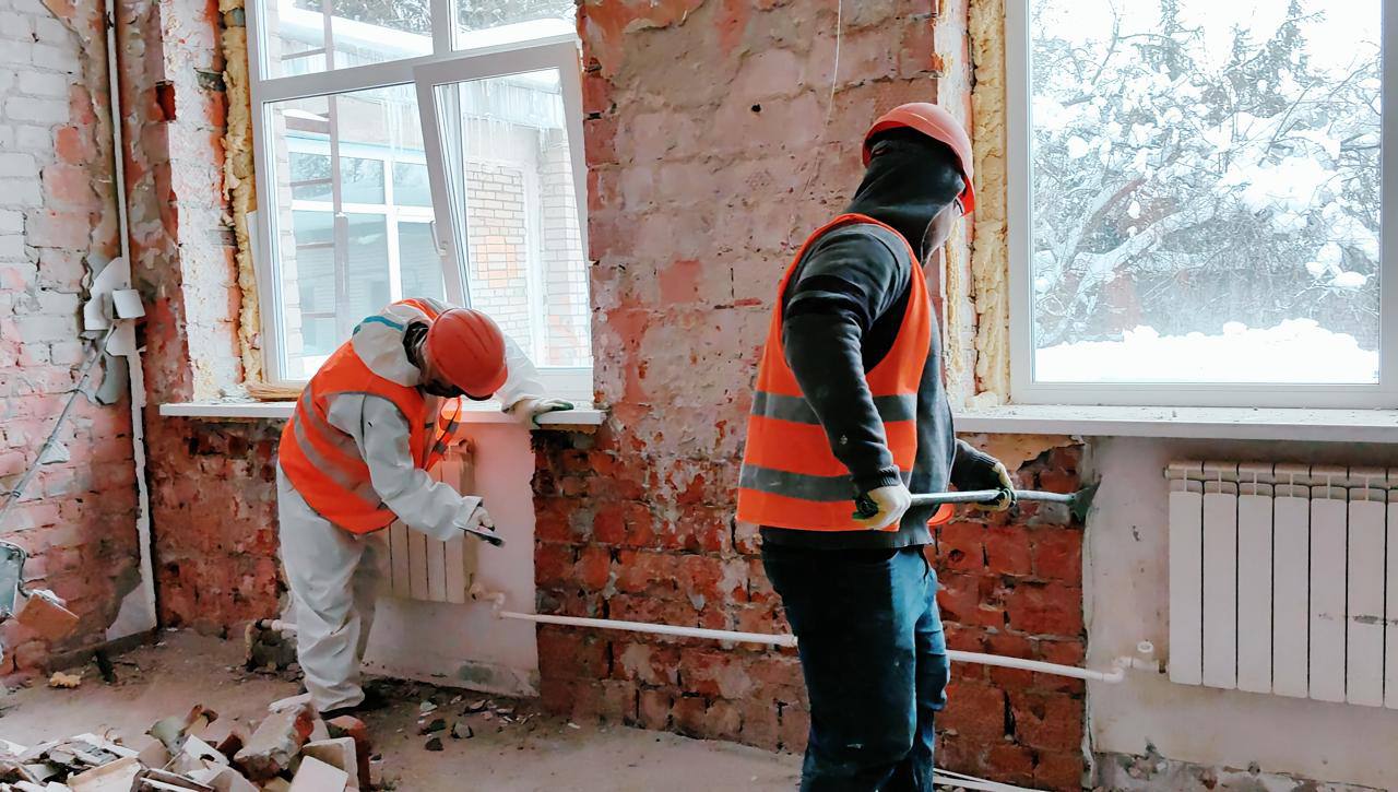 Специалисты демонтируют штукатурку, напольные покрытия и цементные стяжки на первом этаже. На втором этаже ведутся штукатурные работы. Вскоре приступят к отделке помещений и монтажу электрических сетей.