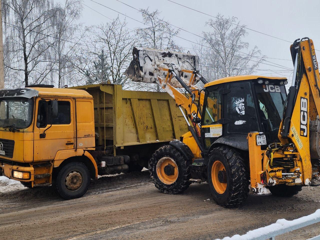 Из-за аварии вода залила дорогу, смешалась со снегом и превратилась в плотную ледяную кашу. После устранения прорыва спецтехника приступила к расчистке.