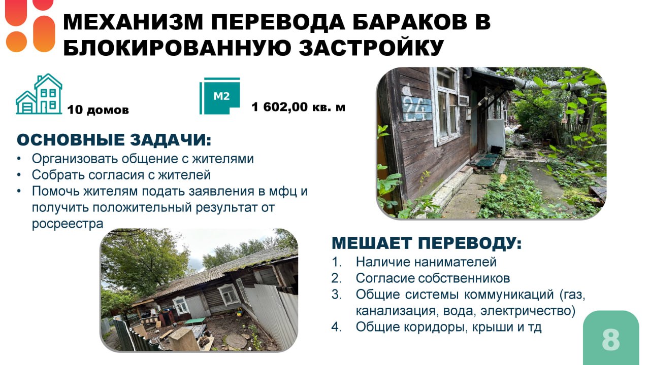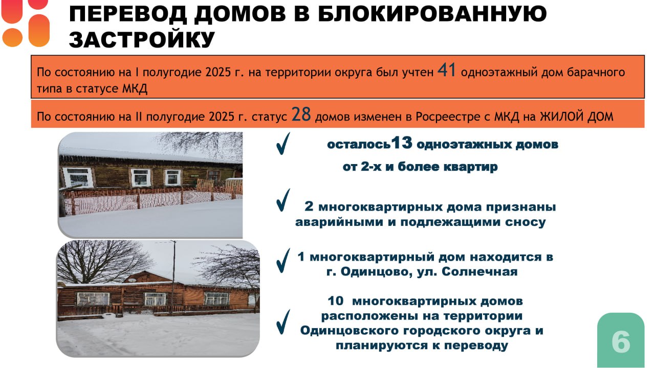 Ещё одно направление — перевод домов барачного типа в категорию блокированной застройки. В 2025 году из 41 одноэтажного барака со статусом МКД 28 уже получили статус жилых домов. Обязательное условие — согласие собственников. Там, где мешают общие коммуникации или конструкции, продолжаем искать решения.