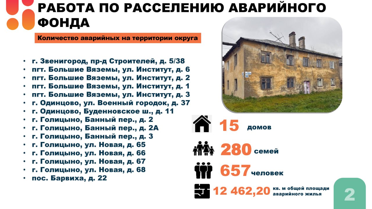 Расселение аварийных домов идёт по муниципальным и областным программам, а также по механизму комплексного развития территорий. Больше всего таких зданий находится в Голицыно — 7 домов, и в Больших Вязёмах — 4 дома. Ещё два дома в Одинцово, по одному — в Звенигороде и посёлке Барвиха. Часть участков относится к федеральной собственности, сейчас идёт работа по их передаче муниципалитету, чтобы можно было запускать расселение.