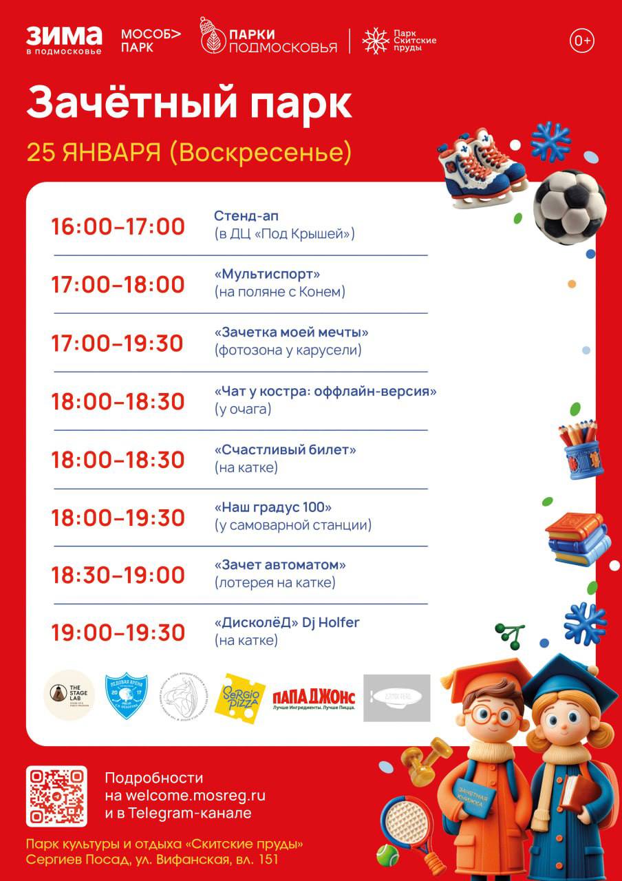 В парке «Скитские пруды» пройдет Стендап в ДЦ «Под крышей», регистрация по ссылке, спортивные игры, также будет работать фотозона «Зачетка моей мечты» и самоварная станция. На катке в парке пройдет дискотека, лотерея и флешмоб.