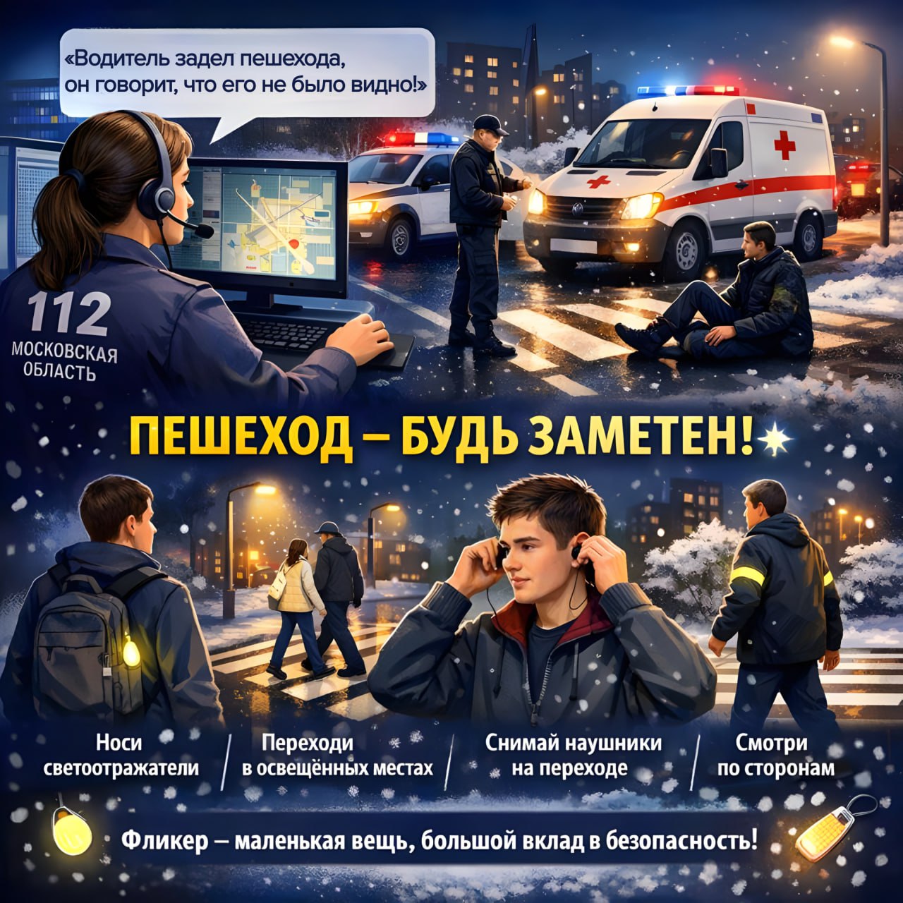 Прикрепите светоотражатель себе и ребёнку — позаботьтесь о безопасности заранее. А если случилась беда — обращайтесь в службу спасения по номеру «112» или через мобильное приложение «112 МО».