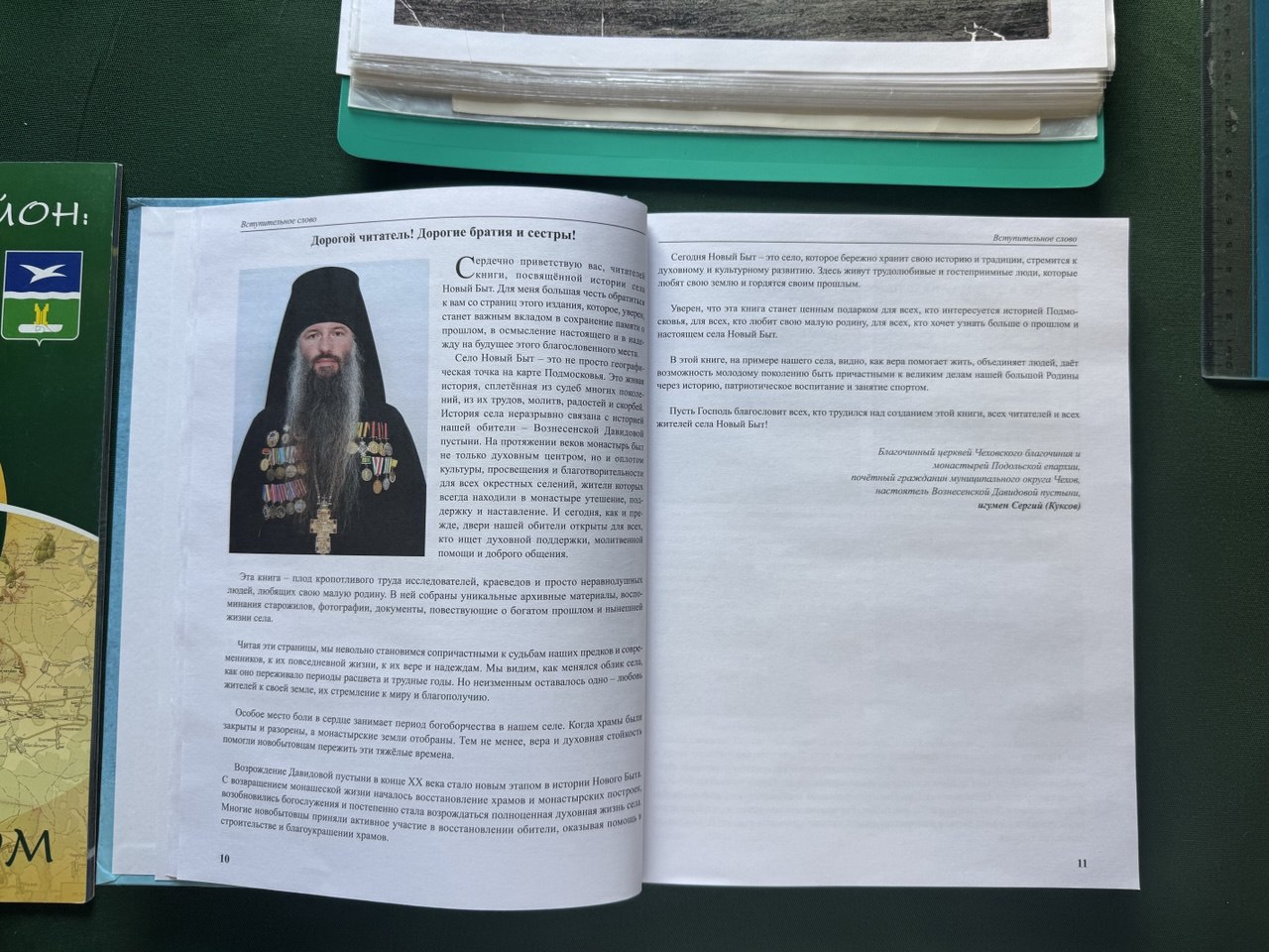 Книга начинается со вступительного слова и благословления Благочинного церквей Чеховского благочиния и монастырей Подольской епархии, почётного гражданина муниципального округа Чехов, настоятеля Вознесенской Давидовой пустыни, игумена Сергия (Куксова).