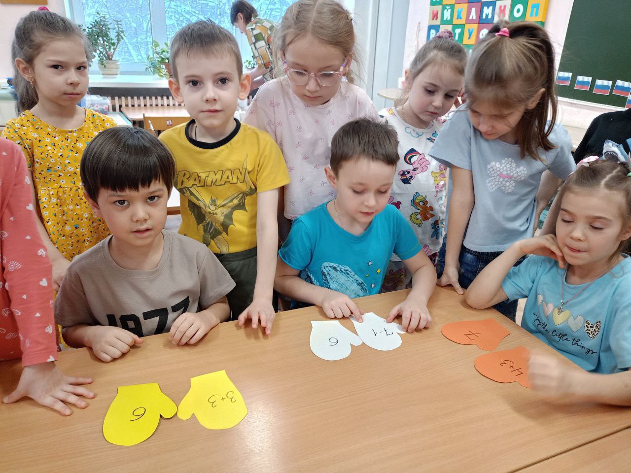 Задачи: продолжать формировать умение отгадывать математические загадки; уточнять знание известных геометрических фигур; закреплять умение считать в пределах десяти (в прямом и обратном порядке) и решать простые арифметические задачи; развивать речь (связную, диалогическую, монологическую), логическое мышление; воспитывать дружеские отношения между детьми.
