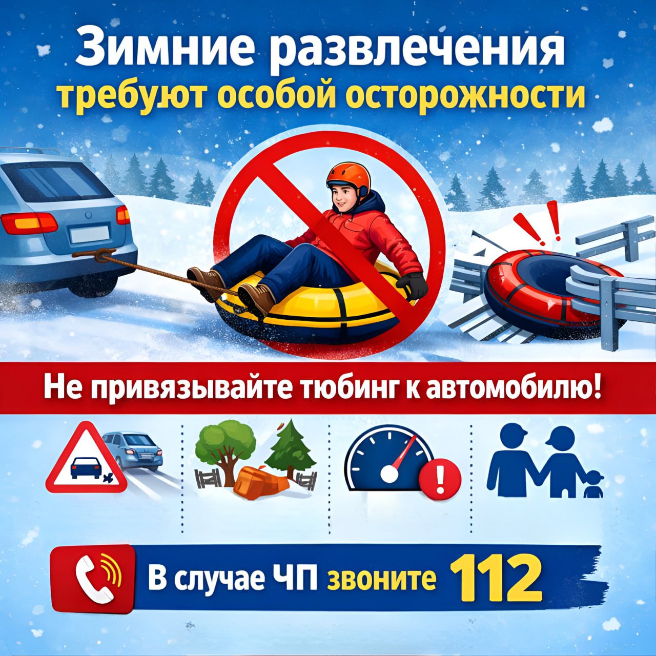 Категорически запрещено кататься на тюбингах и санках, привязывая их к автомобилям, снегоходам или другой технике.