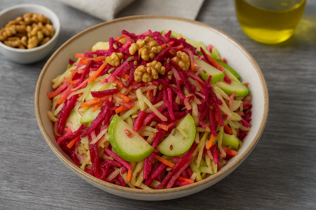 Этот салат — настоящая находка для любителей здорового питания. Хрустящая капуста, ароматное яблоко, сладкая свёкла и свежая морковь создают гармоничное сочетание. А добавление огурца, орехов и пикантного соуса придаёт блюду неожиданный глубинный вкус. Этот салат не только очищает организм, но и насыщает его витаминами, идеально подойдёт в качестве лёгкого ужина или гарнира к мясным угощениям.