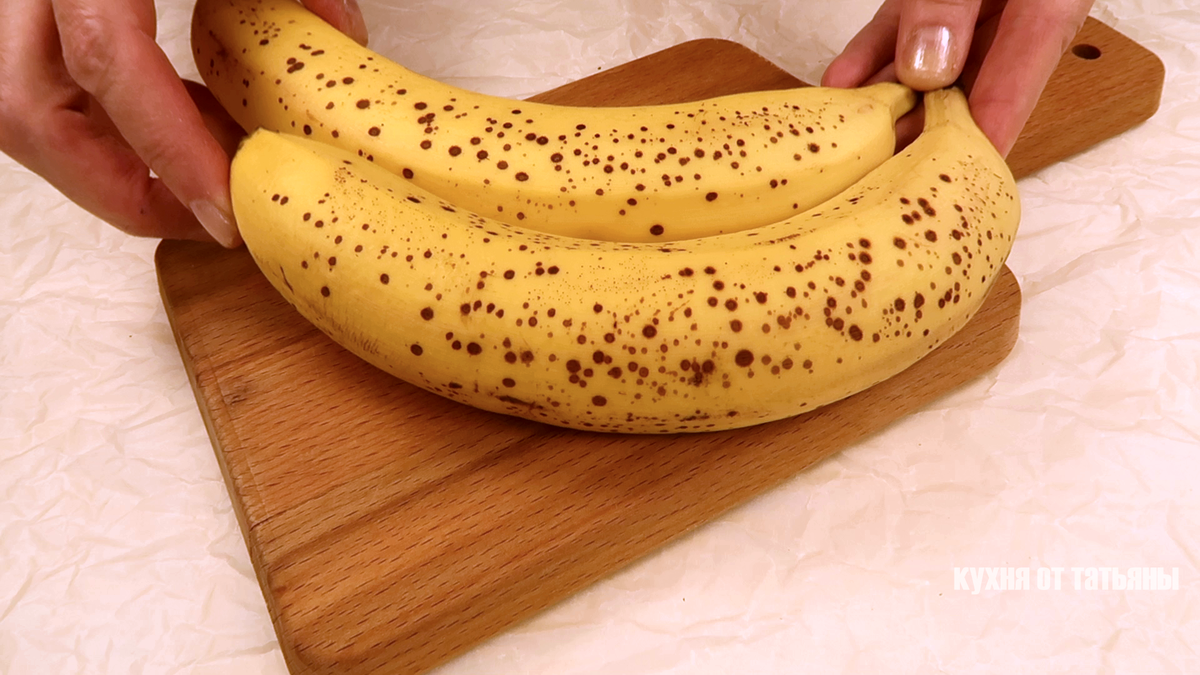 Для начала очищают два банана. Рекомендуется выбирать слегка переспевшие плоды, чтобы выпечка получилась более сладкой. Затем бананы нарезаются на небольшие кусочки и помещаются в миску.