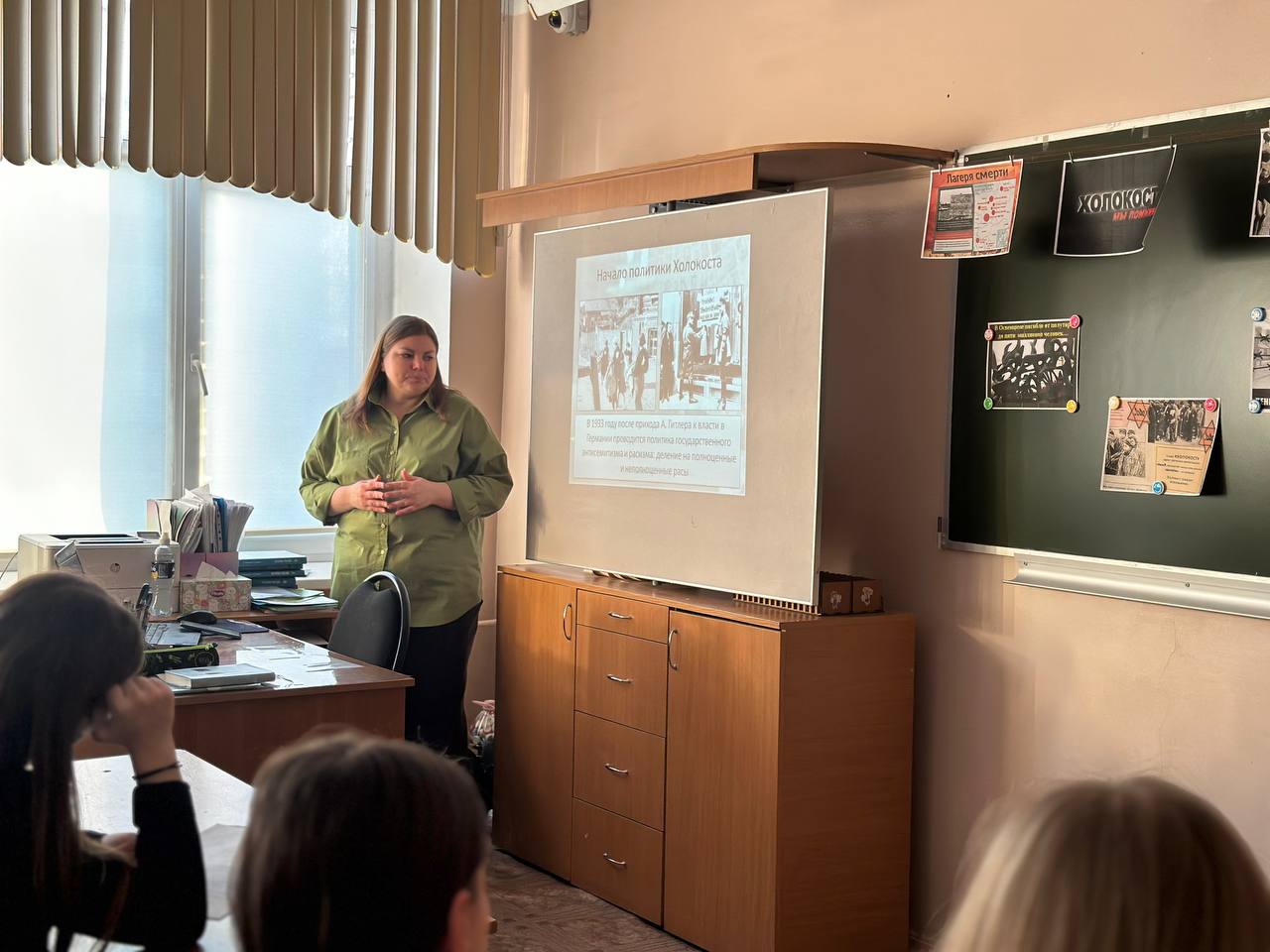 На занятии гимназисты узнали о судьбах реальных людей, пострадавших от преступлений нацистов, увидели архивные фотографии, позволяющие лучше понять атмосферу тех времен.