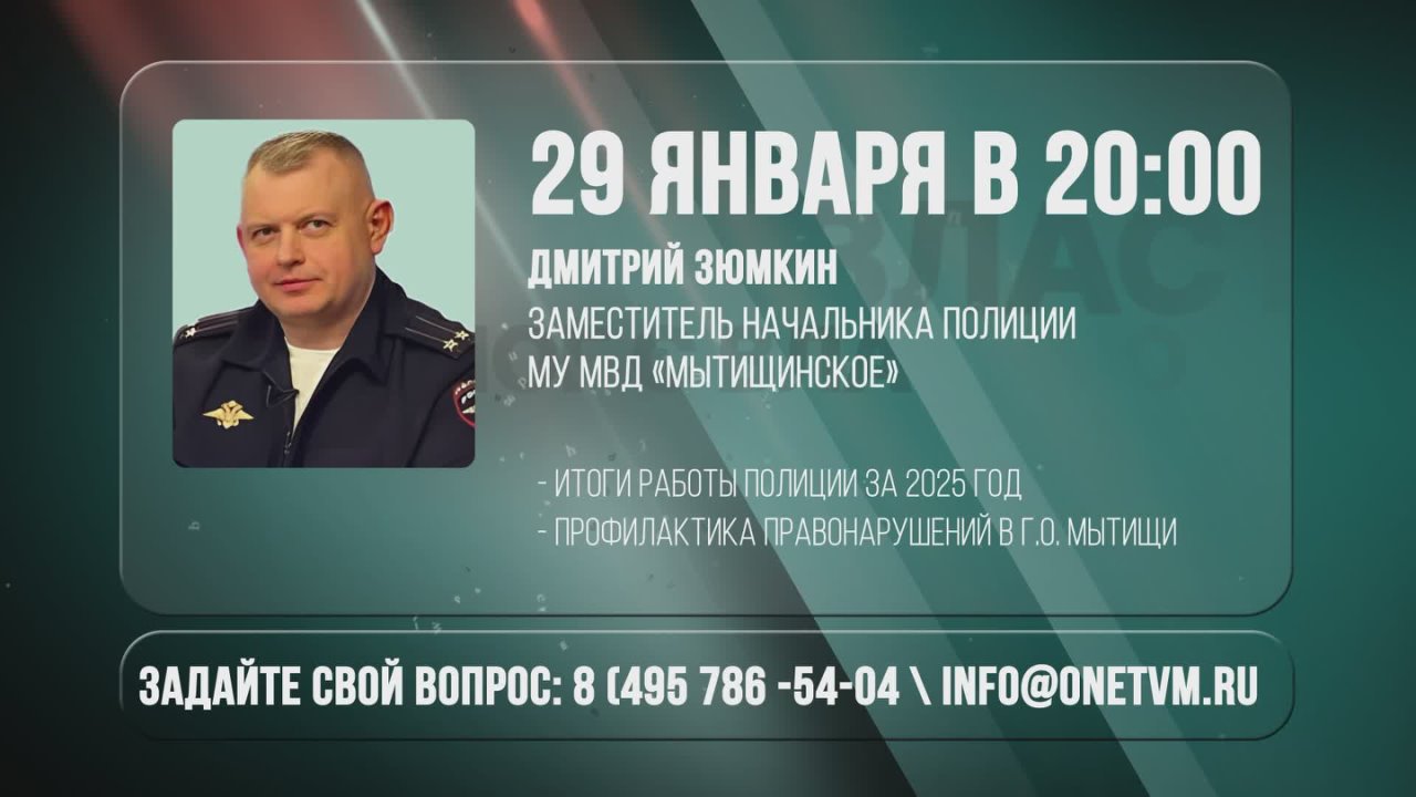 29 января в 20:00 в прямом эфире выступит заместитель начальника полиции МУ МВД «Мытищинское» Дмитрий Зюмкин. Гость студии подведет итоги работы полиции, как удалось увеличить раскрываемость преступлений и ответит на вопросы наших телезрителей.