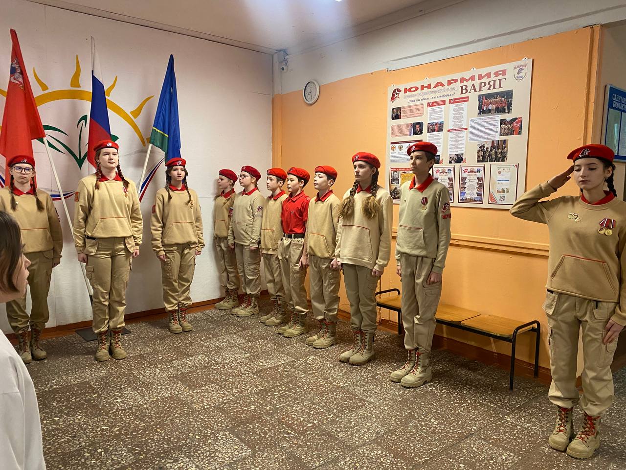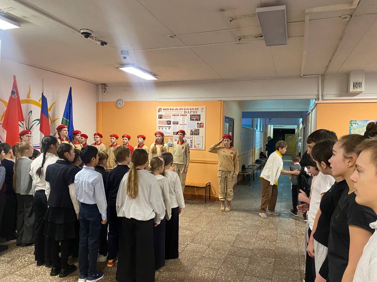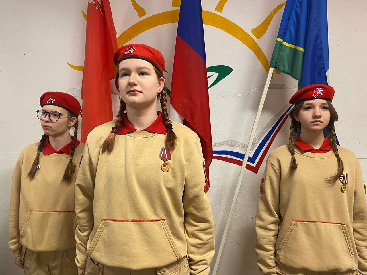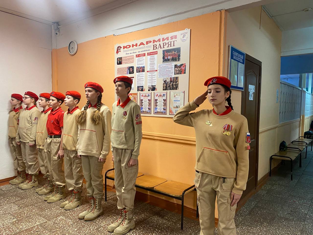 Почетное право выноса государственного флага предоставлено ученице 8д класса юнармейцу Хаустовой Софье.