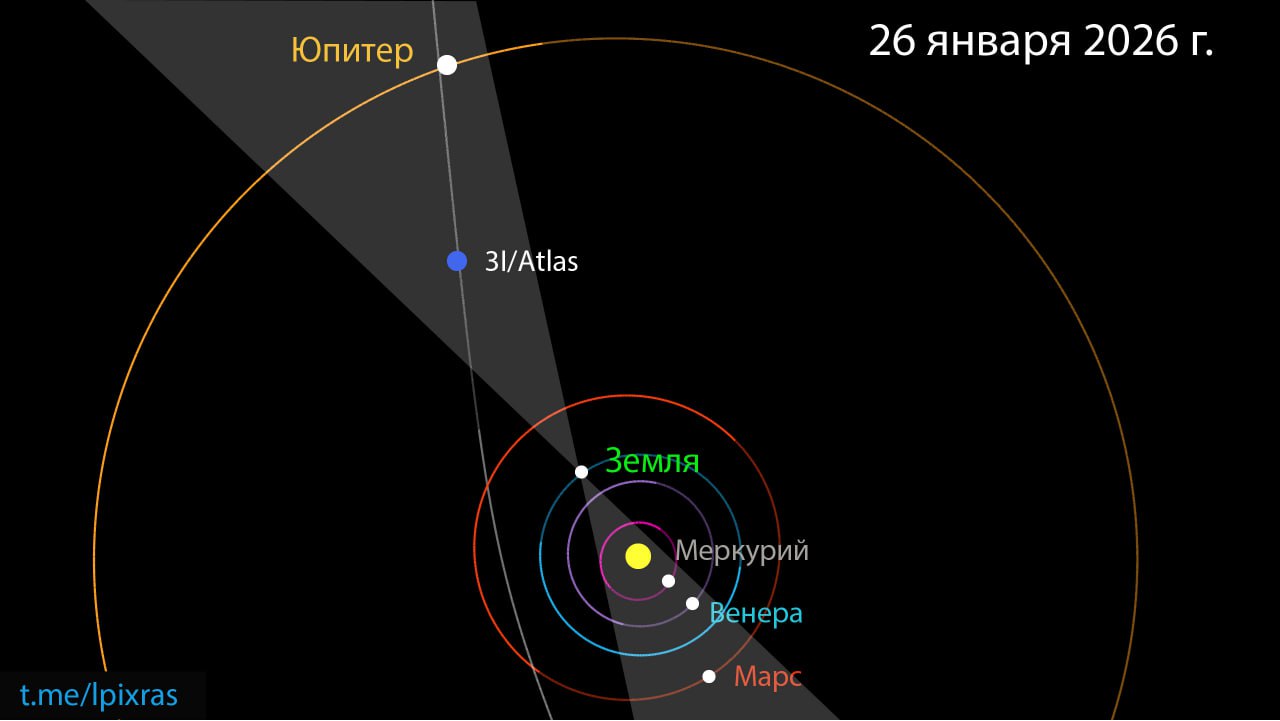 Комета 3I/ATLAS сейчас находится примерно на середине пути между Землёй и Юпитером. С крупнейшей планетой Солнечной системы она сблизится 16–17 марта, сообщили в Лаборатории солнечной астрономии (XRAS).