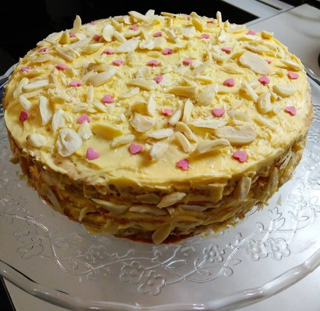 После остывания коржей они собираются поэтапно в торт, каждый корж промазывается заварным кремом и посыпается миндальными лепестками. Это не требует пропитки, но перед подачей торт необходимо охладить.