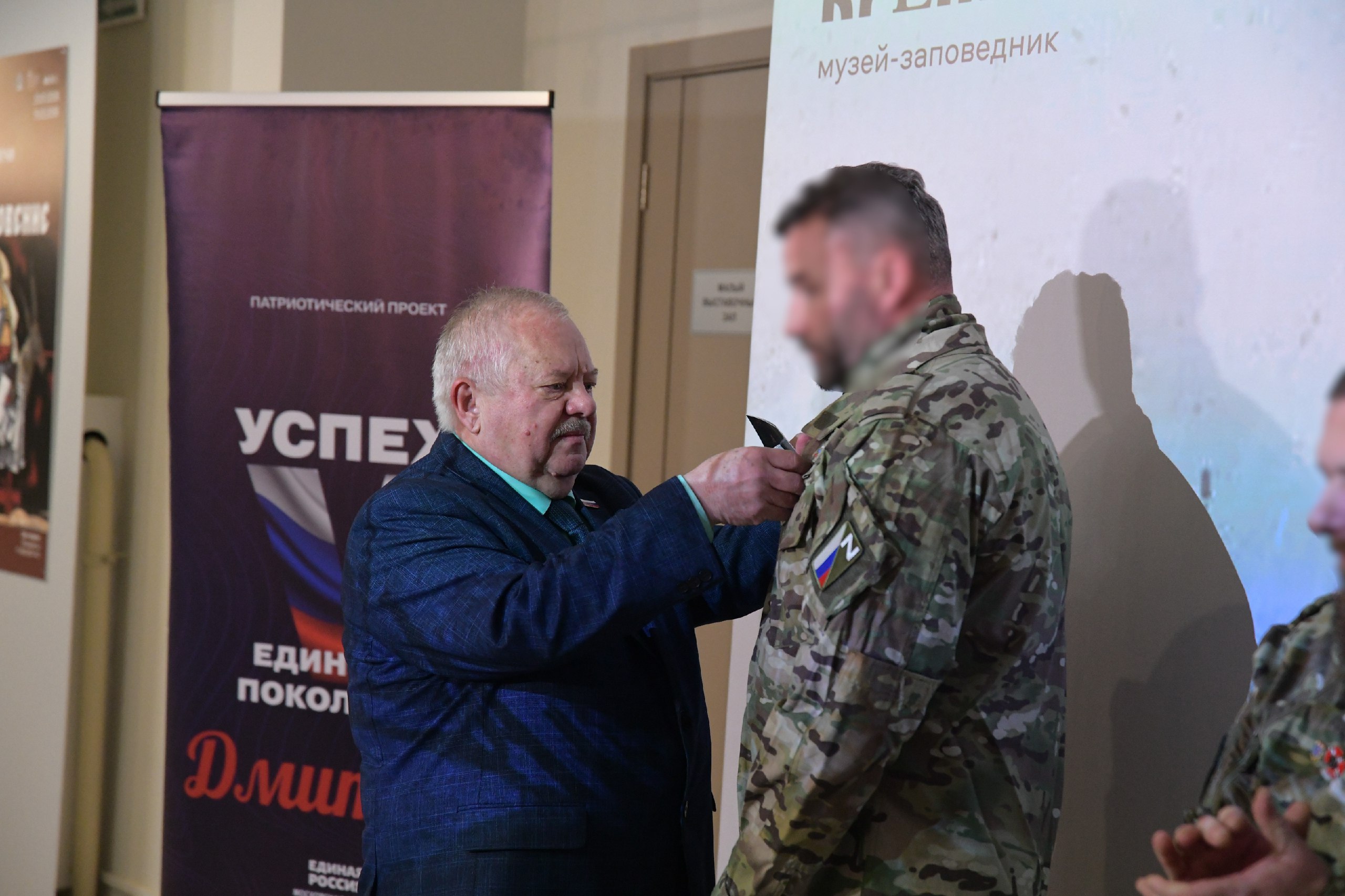 Перед началом мероприятия руководитель местного отделения «Боевого братства» Владимир Кузовлев отметил преемственность поколений защитников Отечества и вручил медаль «Ветерану боевых действий» участнику СВО Евгению с позывным «Дюна».