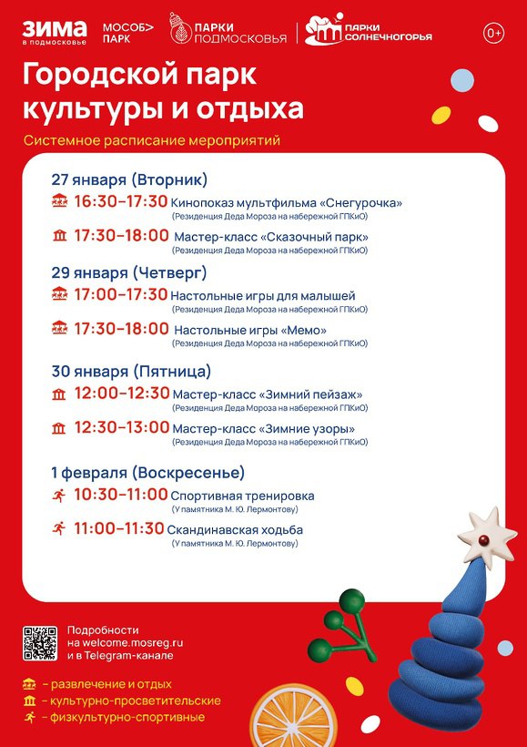 Подробное расписание в афише и ТГ-канале парка: @park_soln.