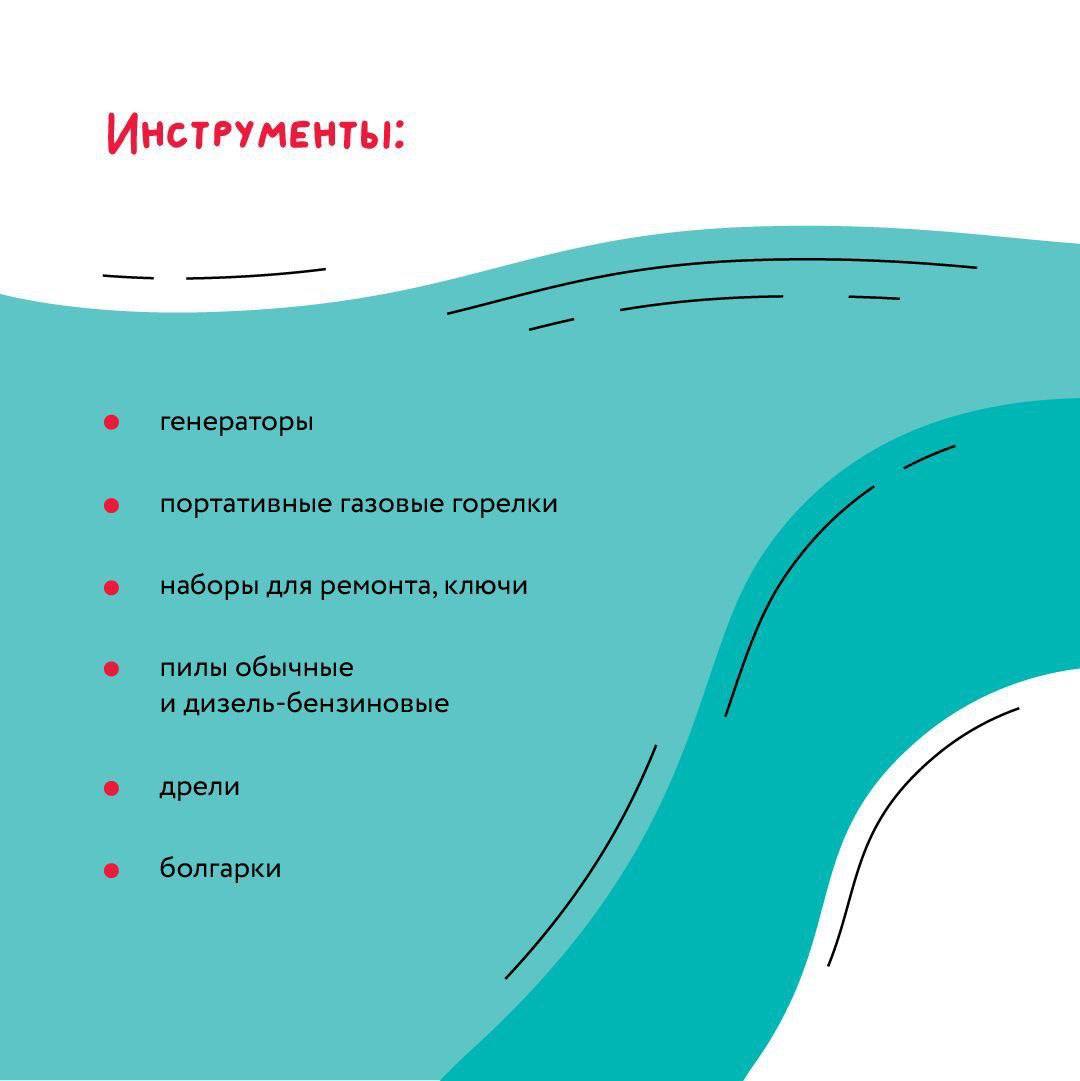 Продукты длительного хранения, нательное белье, перчатки, шапки, инструменты, газовые и электрические плиты, фонари, батарейки, лапшу, пюре быстрого приготовления, одноразовая посуда, крупы, орехи, сухофрукты, гигиенические принадлежности, влажные салфетки.