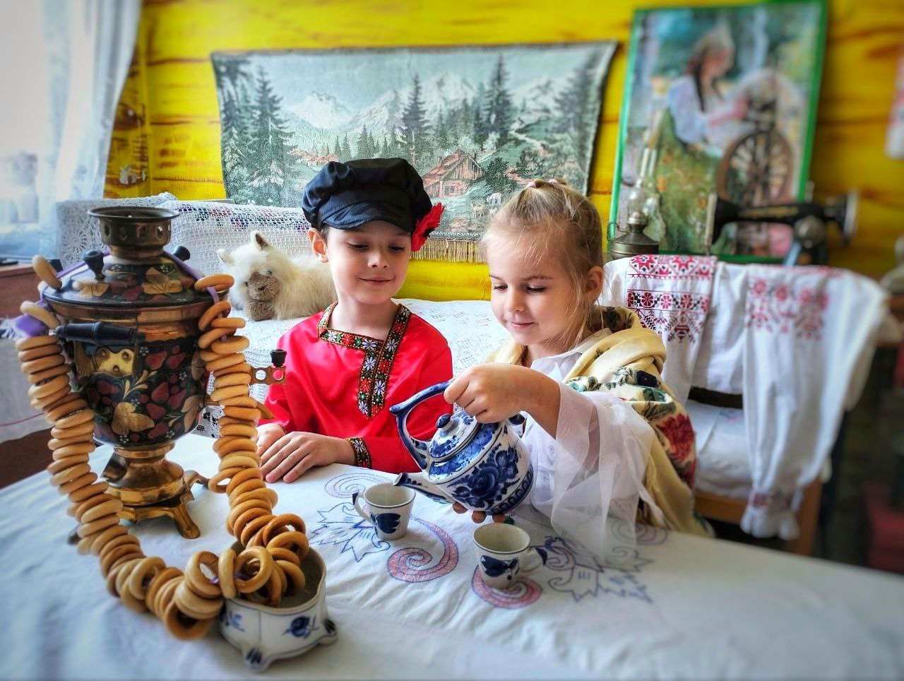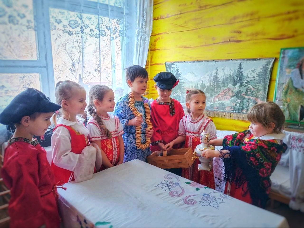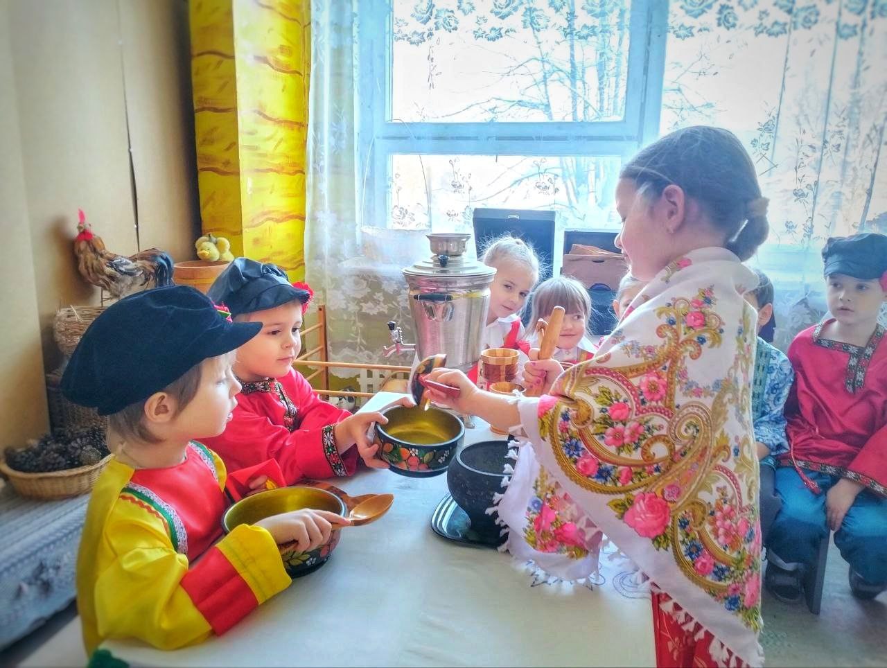 В рамках реализации проекта «Предшкола: стандарт детского сада» в дошкольном отделении гимназии №2 м.о. Чехов (здание 3, п. Васькино) на тематической неделе «Моя Россия» - лексическая тема «Посуда. Продукты питания» - воспитанники средней группы №45 побывали в русской избе, познакомились с утварью, материалами изготовления посуды, правилами сервировки. Дошколята ознакомились с народными традициями встречи гостей, поиграли в русские народные игры, посмотрели мультфильм «Федорино горе» и слепили из пластилина новый чайный сервиз для Федоры.