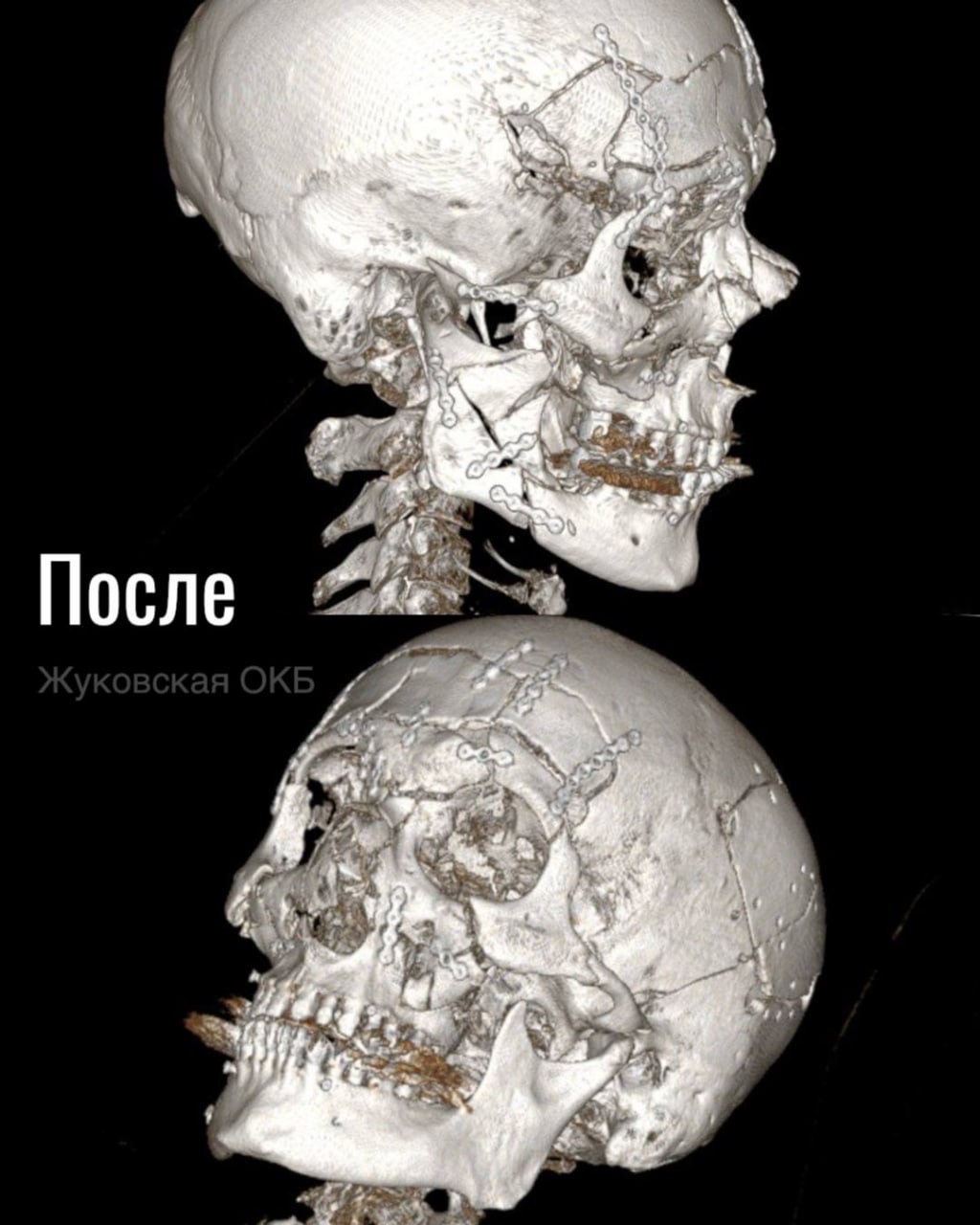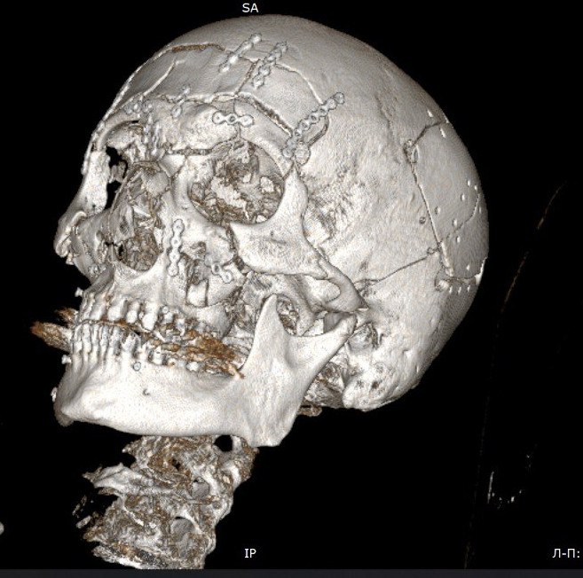 На челюстно-лицевом этапе выполнены мобилизация и репозиция костных отломков, восстановлены лобная кость, часть глазницы, контуры орбит с обеих сторон, верхняя челюсть и правая половина нижней челюсти с фиксацией титановыми минипластинами.