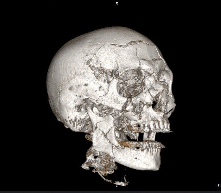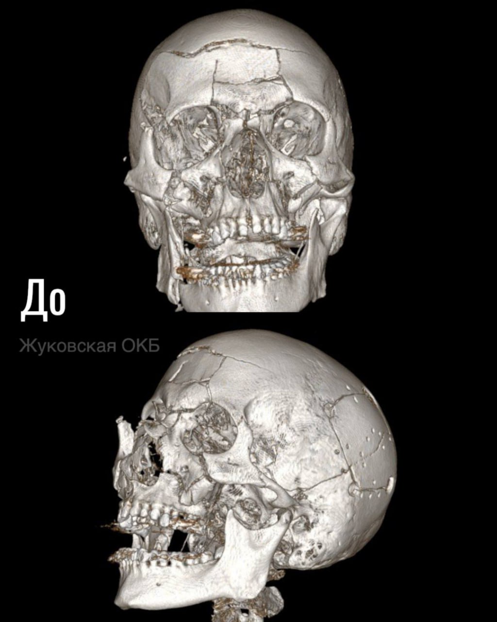 В реанимационное отделение Жуковской областной клинической больницы был доставлен пациент 44 лет в тяжёлом состоянии после падения со снегохода. У него диагностированы многооскольчатые переломы верхней, средней и нижней зон лица с выраженным нарушением конфигурации лицевого скелета, а также многофрагментарный перелом лобной кости.