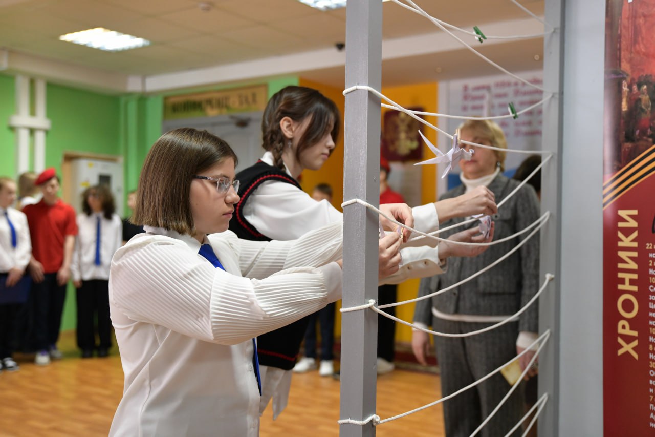 Завершилась линейка акцией «Блокадная ласточка». Участники прикрепили бумажных птичек к памятной экспозиции. Этот символ, который носили в осаждённом городе, был знаком надежды и ответом врагу: «Мы ждём хороших вестей, мы верим в победу, мы — с Родиной!».