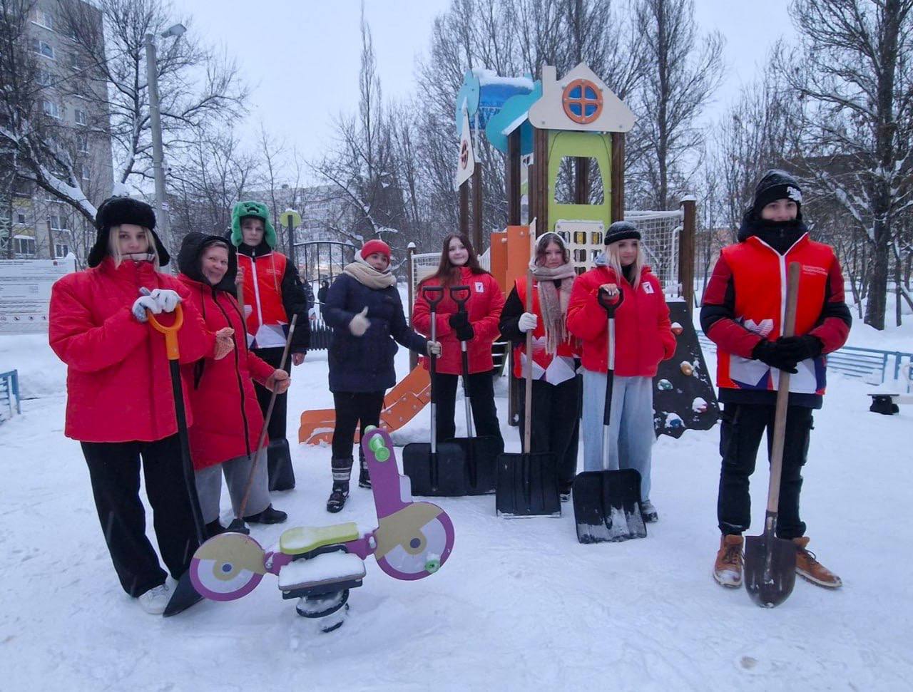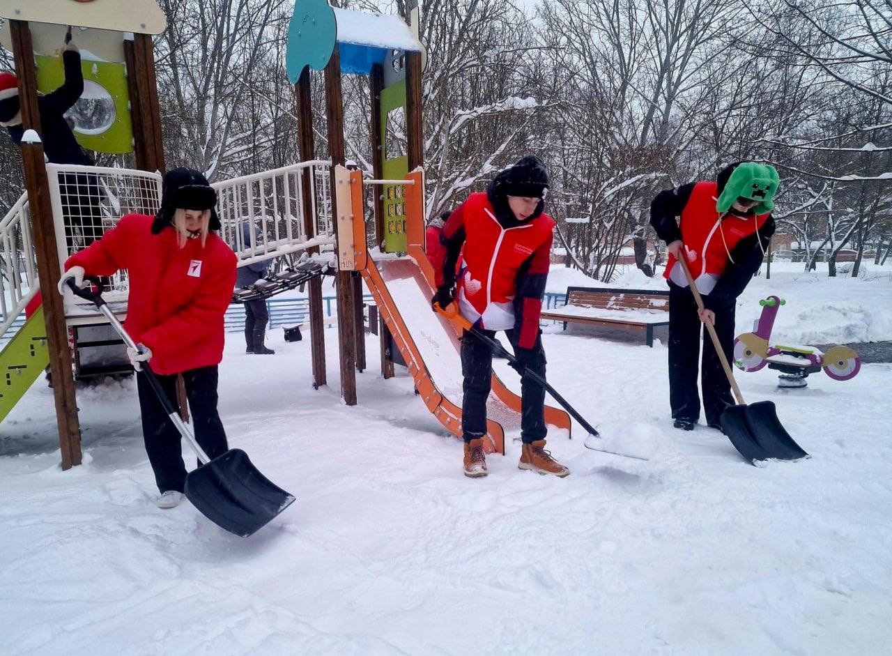 В городе продолжается уборка снега после сильных осадков. На помощь коммунальщикам пришли добровольцы из движения «Волонтёры Подмосковья». Они убрали снег на двух детских площадках возле молодёжного центра «Олимпиец», чтобы детям было удобнее играть на свежем воздухе.