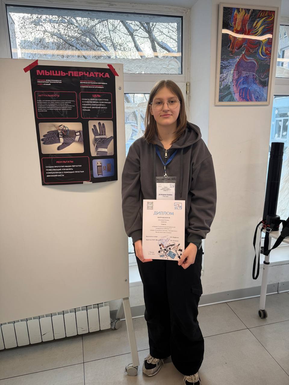 Ученица школы №15 из Балашихи Полина Долецкая победила на первой технологической конференции «ПРОЕКТ-17». Школьница представила свой проект «Мышь-перчатка» в секции «Сенсорные системы, электроника и вычислительная техника».