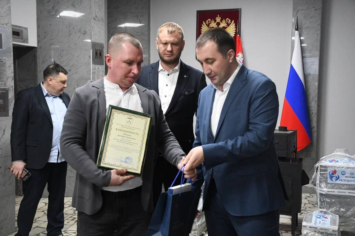 Глава городского округа Жуковский Андроник Пак вручил сотрудникам предприятия благодарственные грамоты и поблагодарил за их работу: «Хочу искренне поблагодарить директора предприятия Вадима Сергеевича Фролова и коллектив «Векпрома» за неравнодушие, активную гражданскую позицию и реальную помощь нашим защитникам».