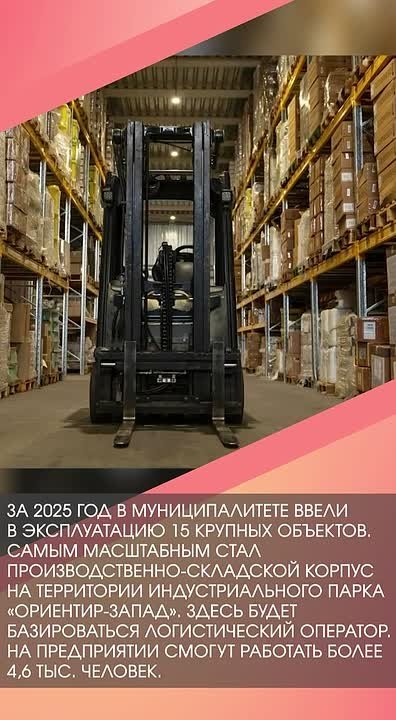 За 2025 год в муниципалитете ввели в эксплуатацию 15 крупных объектов. Самым масштабным стал производственно-складской корпус на территории индустриального парка Ориентир-Запад. Здесь будет базироваться логистический оператор. На предприятии смогут работать более 4,6 тыс. человек.