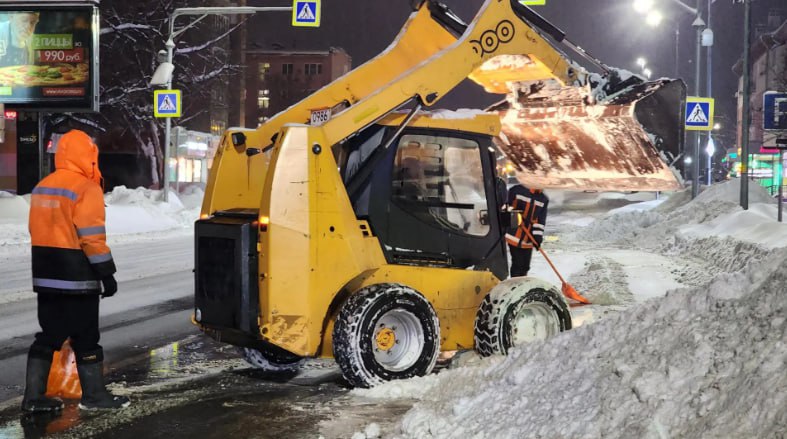 Для борьбы с последствиями снегопада задействована вся имеющаяся техника. Сегодня ночью на линии: мини-погрузчики, большие погрузчики, ээкскаватор-погрузчик, КДМ на базе КамАЗа.