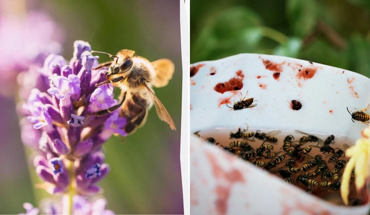 Для борьбы с осами в саду можно создать простые самодельные ловушки. Просто разрежьте пластиковые бутылки пополам и вставьте верхнюю часть в нижнюю горлышком вниз. Заполните емкость водой с сахаром или медом. Осы охотно попадают в такие ловушки, после чего тонут.