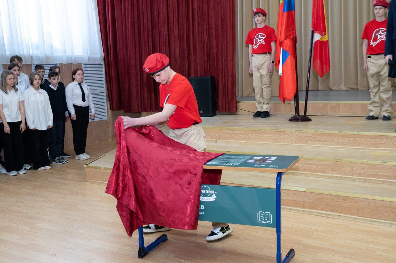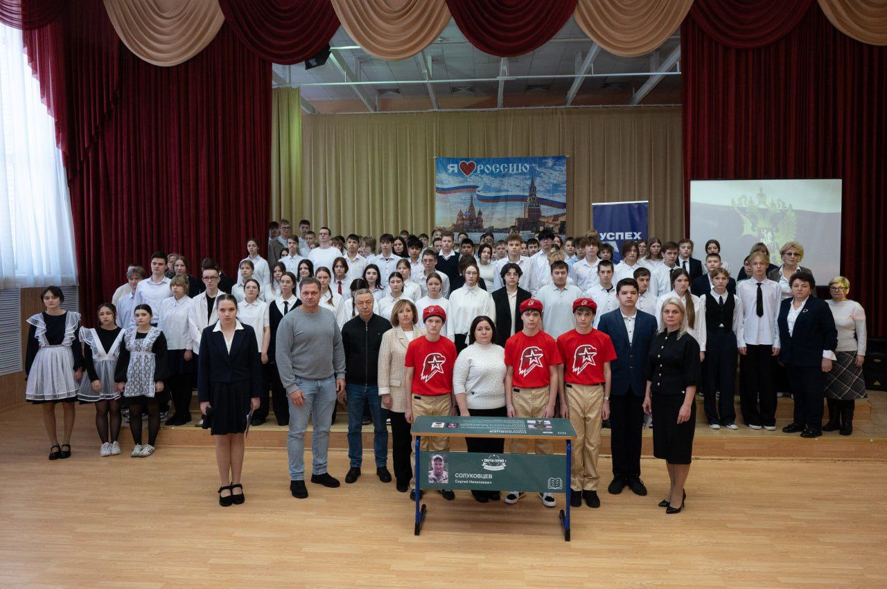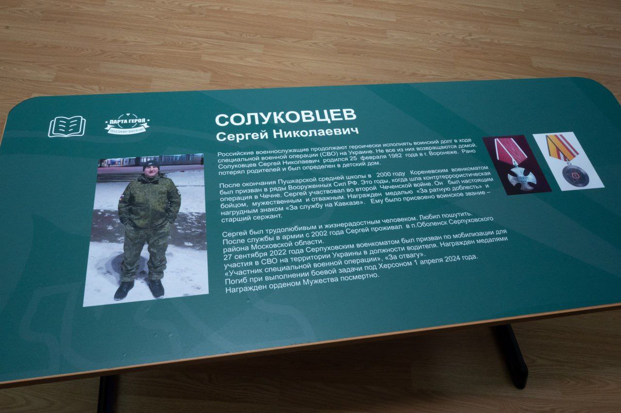 В Оболенской школе открыли #ПартуГероя участнику СВО Сергею Солуковцеву. Здесь учится его сын Иван.