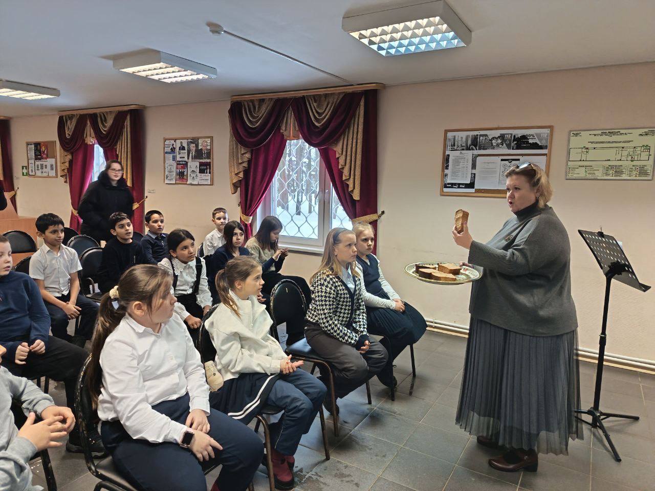 На мероприятии ведущая рассказала ребятам о самых трагичных страницах истории Великой Отечественной войны - блокаде Ленинграда. Ребята узнали, что значил звук метронома для жителей блокадного города, узнали как выглядели 125 грамм хлеба - блокадная норма, подержали в руках настоящую хлебную карточку, посмотрели хроники того страшного времени и почтили минутой молчания память жертв блокады Ленинграда.