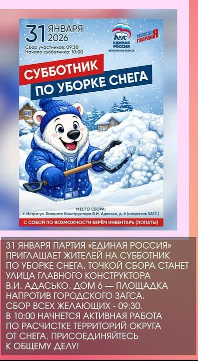 31 января партия «Единая Россия» приглашает жителей на субботник по уборке снега. Точкой сбора станет улица Главного Конструктора В.И. Адасько, дом 6 — площадка напротив городского ЗАГСа. Сбор всех желающих - 09:30. В 10:00 начнется активная работа по расчистке территорий округа от снега. Присоединяйтесь к общему делу!