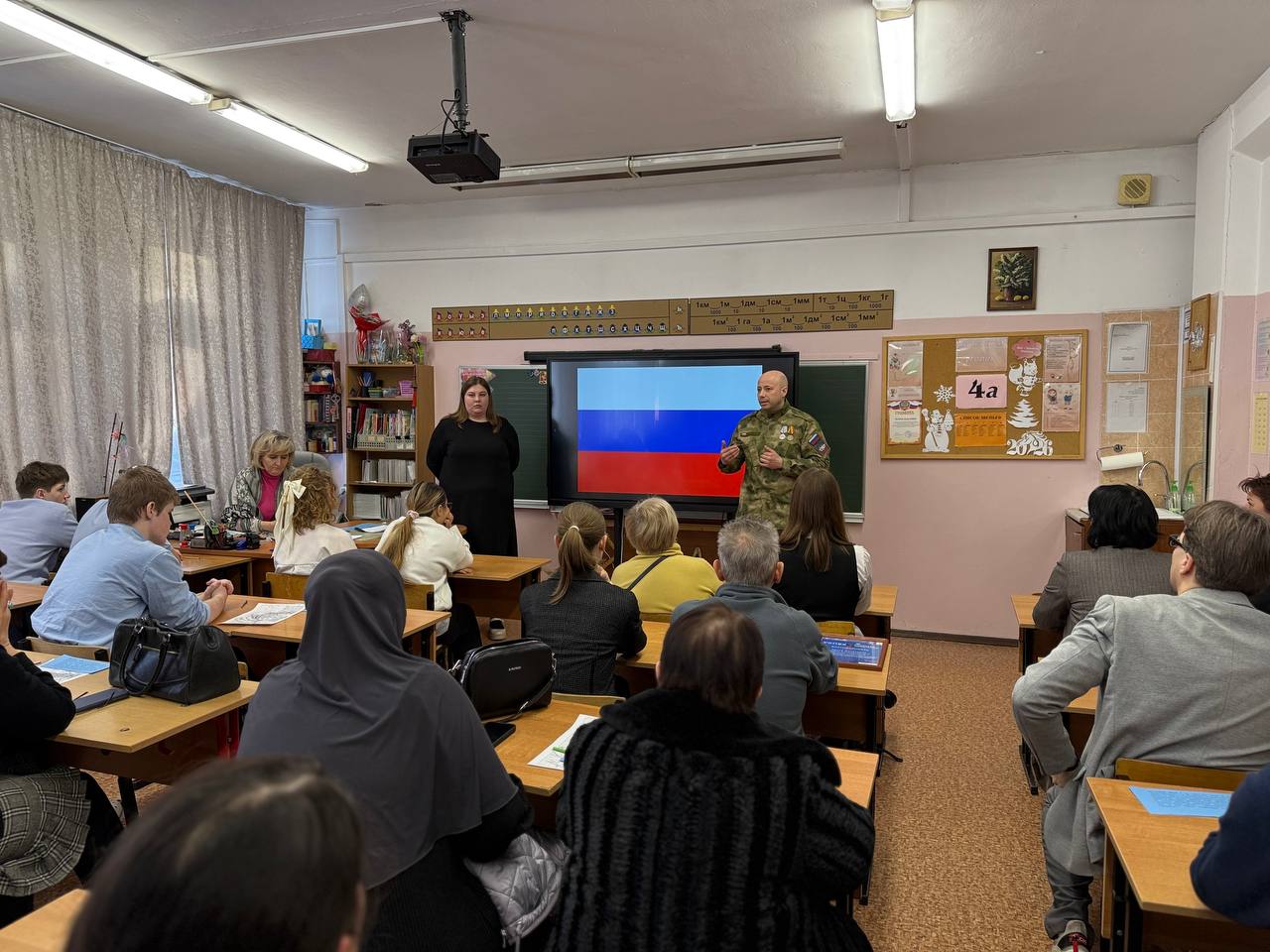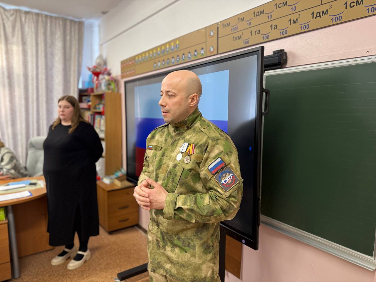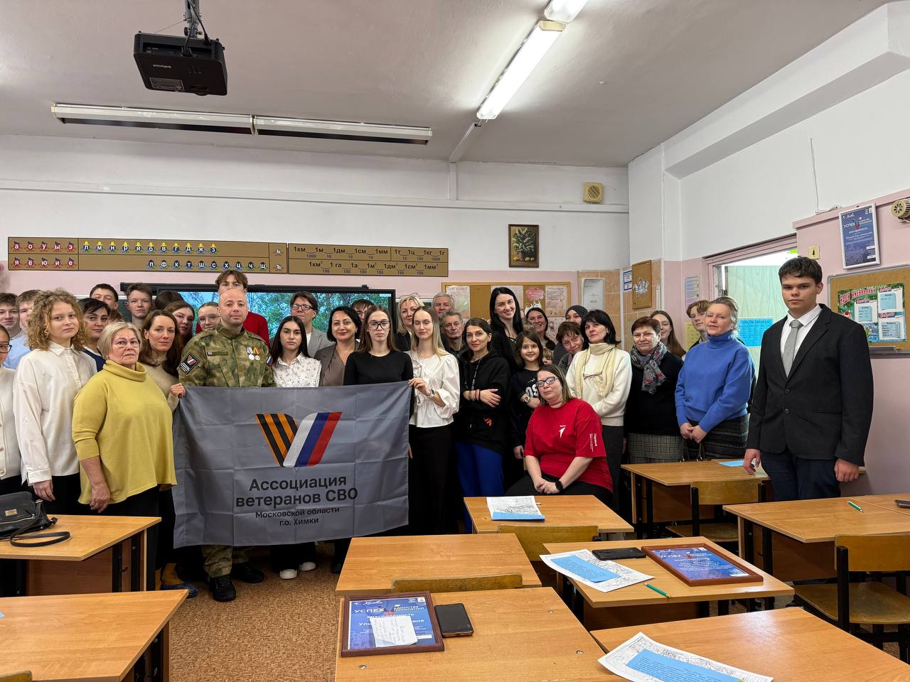 Урок посетил руководитель Химкинского отделения Ассоциации ветеранов СВО Александр Александров. Он рассказал о подвигах современных героев, а также поделился историей своего боевого пути.
