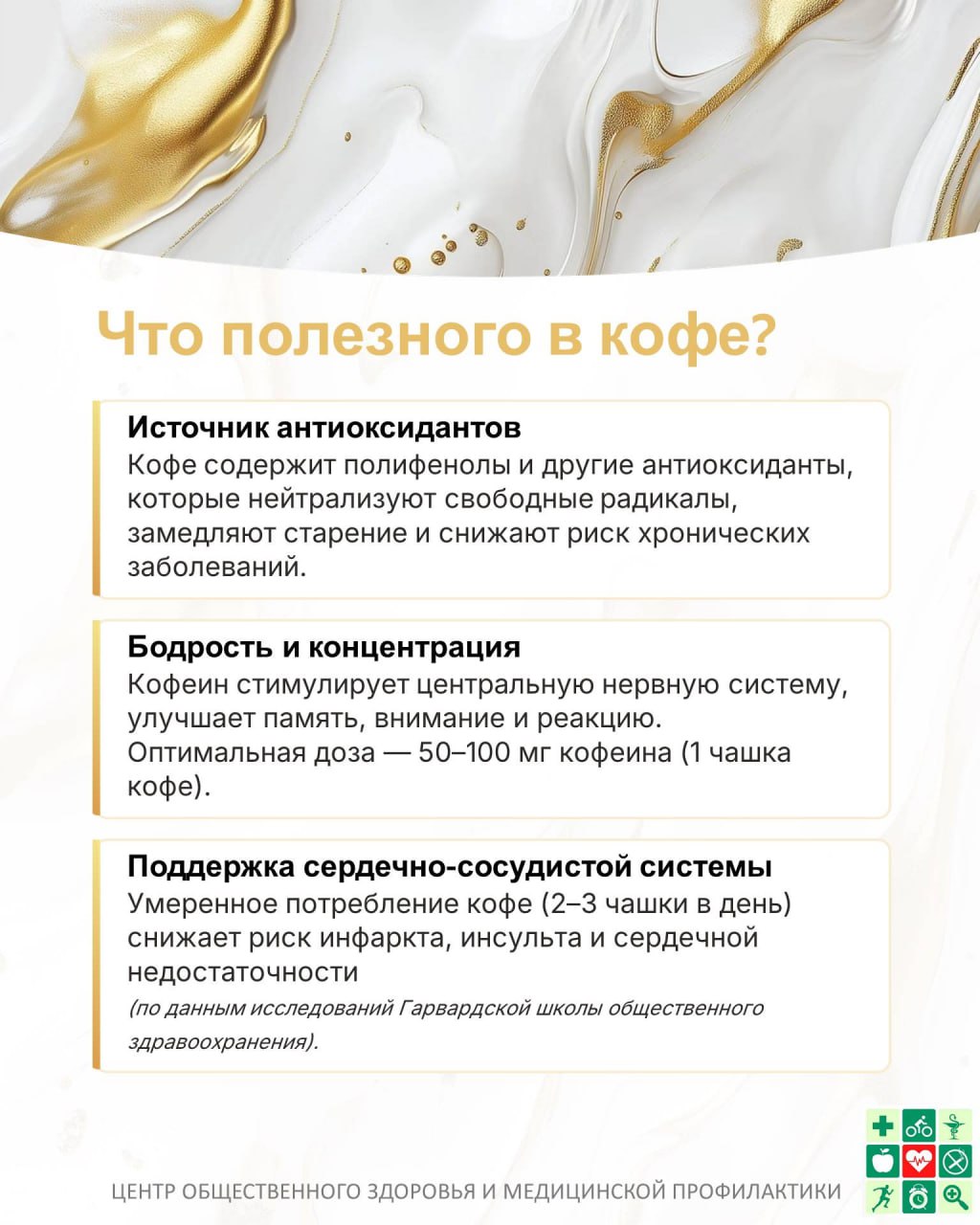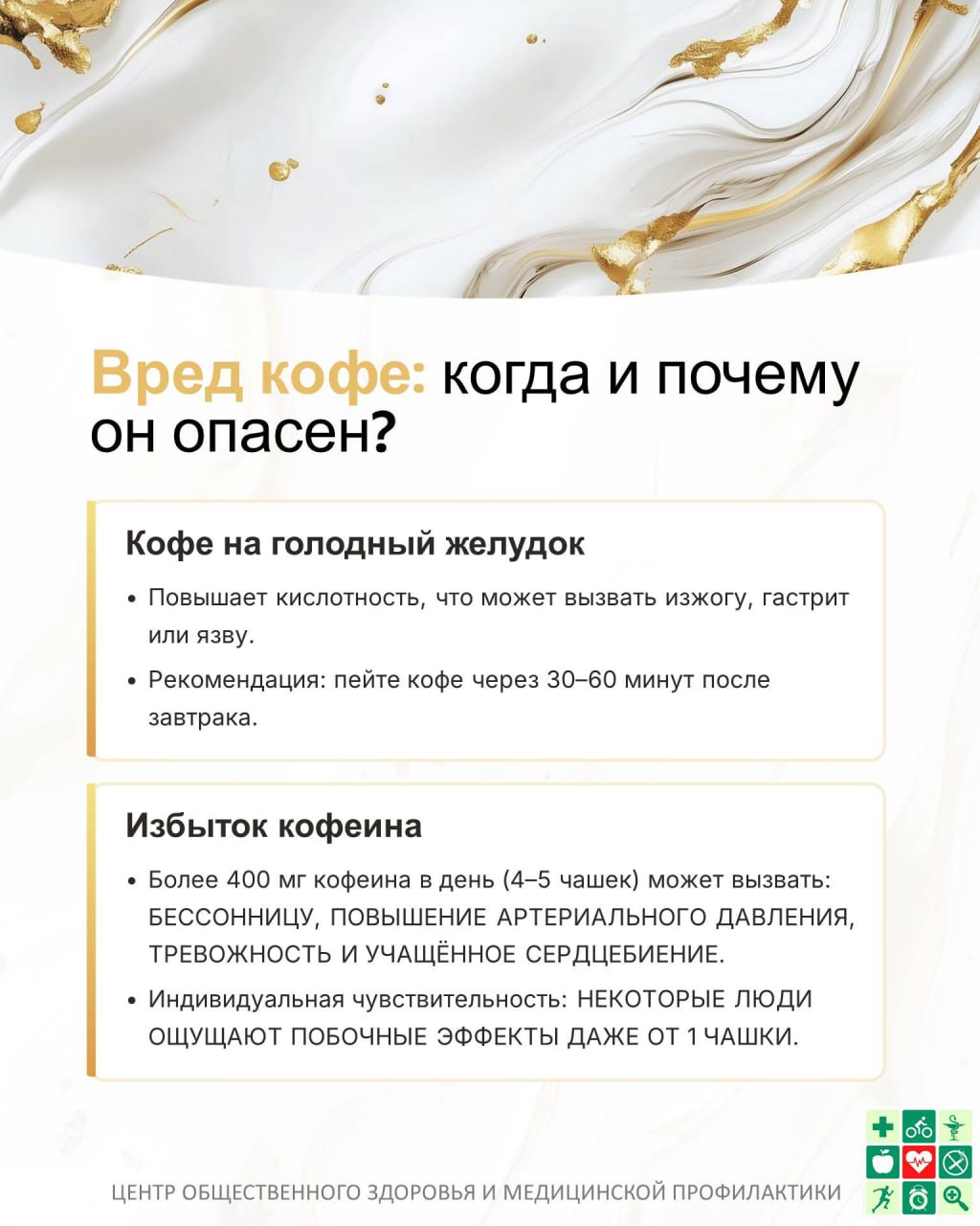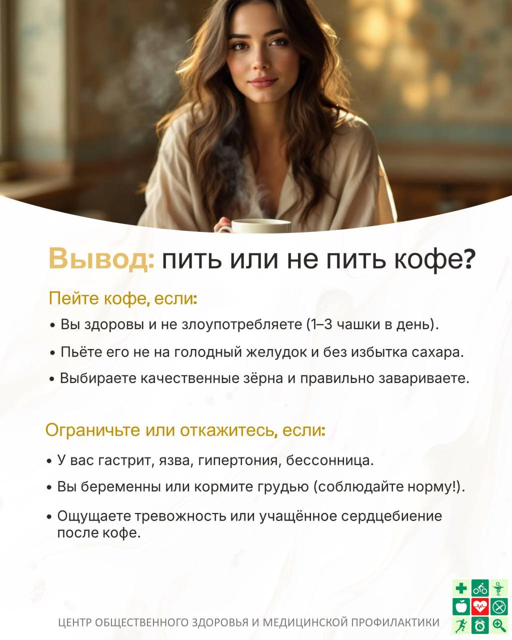 В карточках Центра общественного здоровья и медицинской профилактики, разобраны все нюансы этого напитка, чтобы вы могли наслаждаться кофе максимально безопасно и с пользой для здоровья.