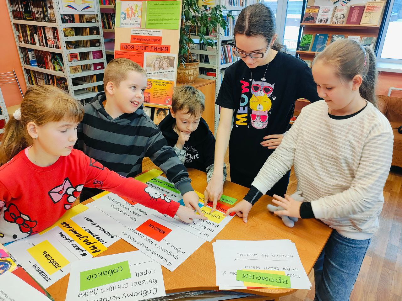 Дети разбились на команды и выполняли задания: играли в викторину-лото, собирали правильные слова из цитат Чехова и участвовали в веселой эстафете.