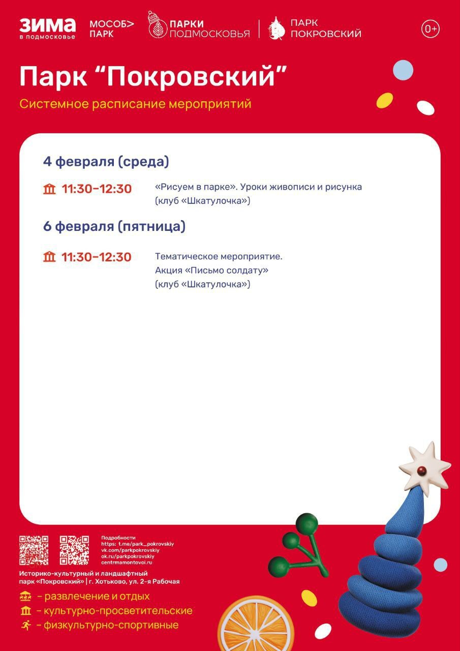 В парке «Покровский» г. Хотьково пройдут уроки живописи «Рисуем в парке», акция «Письмо солдату», подвижные игры «Мультландия», уроки мастерства, мероприятия «Спорт для всех» и «Краеведческий поход».