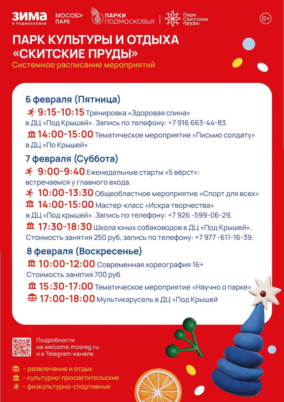 В парке «Скитские пруды» в Сергиевом Посаде пройдут мастер-класс по фигурному катанию на катке, растяжка в ДЦ «Под Крышей», видеолекция «М.М. Пришвин — писатель, фотограф, краевед…», тренировка «Здоровая спина», мультикарусель, еженедельные старты «5 верст» и многое другое.