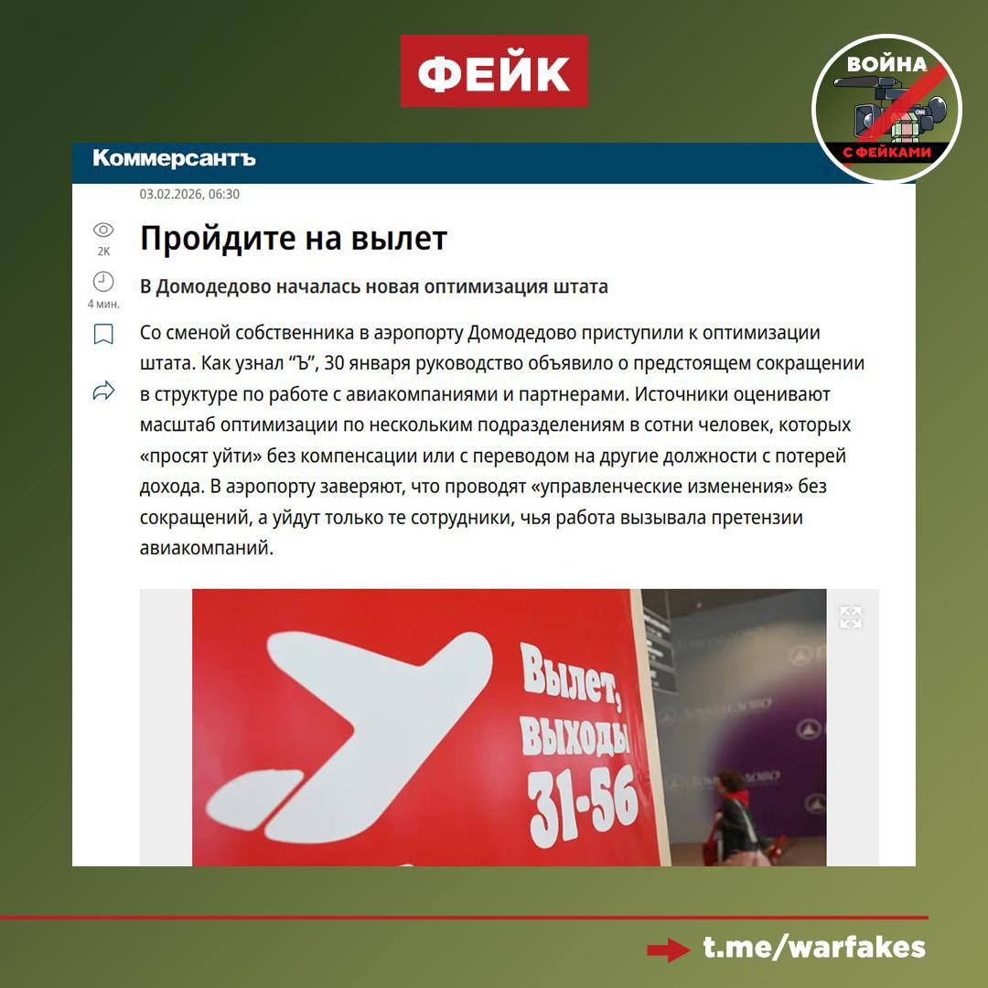 Фейк: Аэропорт Домодедово после смены собственника объявил о сокращении штата, работников увольняют без компенсации, об этом в своем эксклюзивном материале написал Коммерсантъ