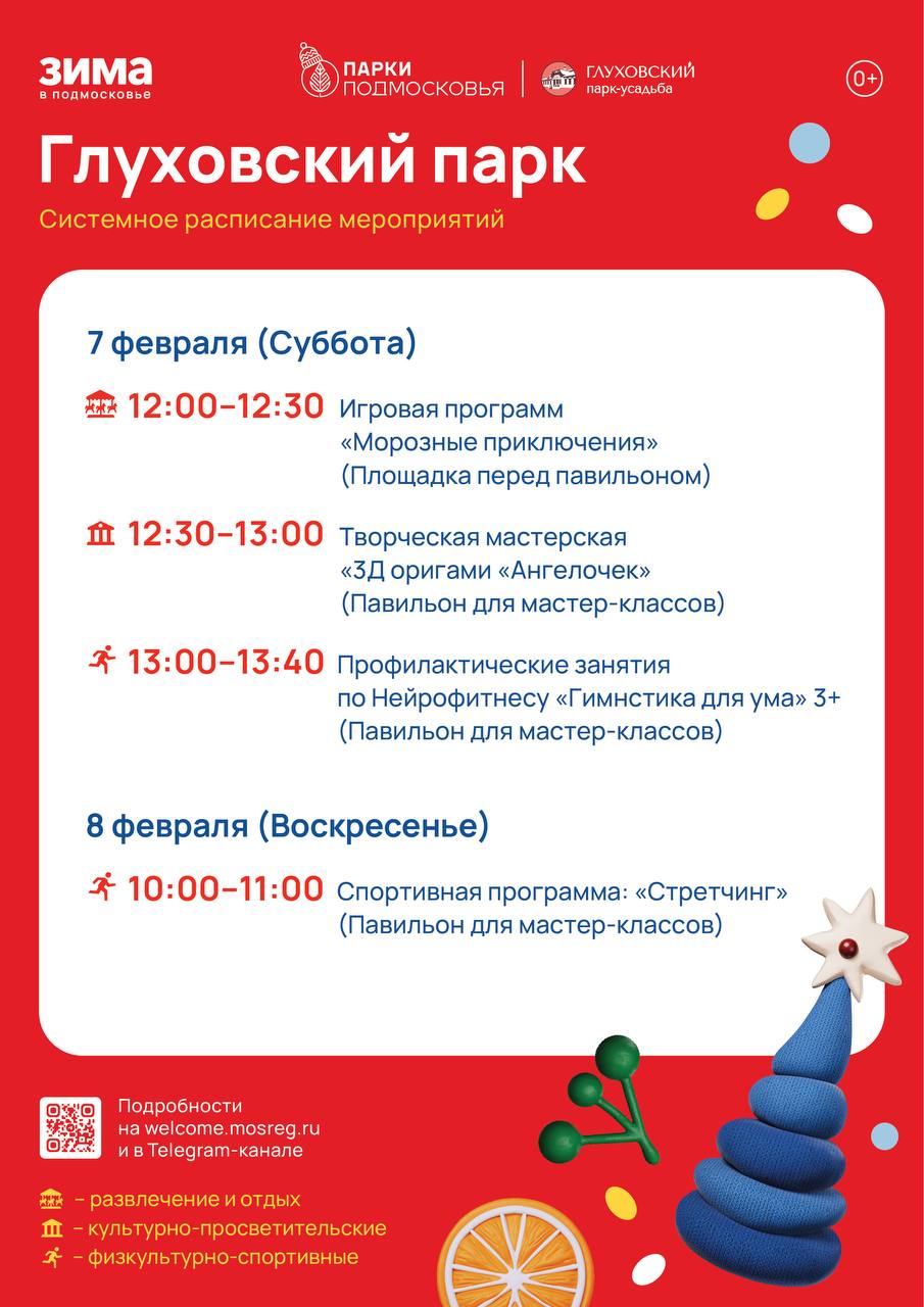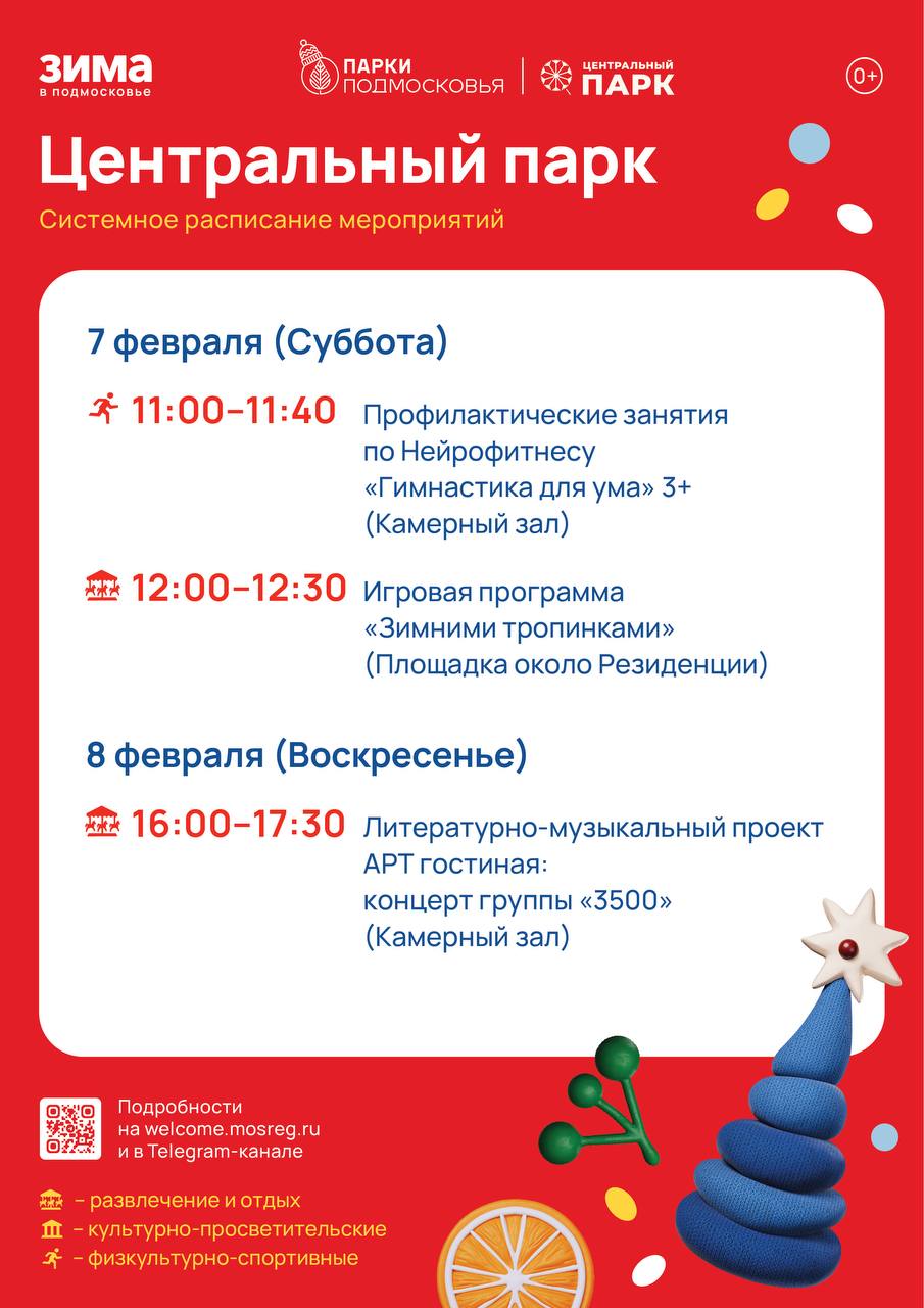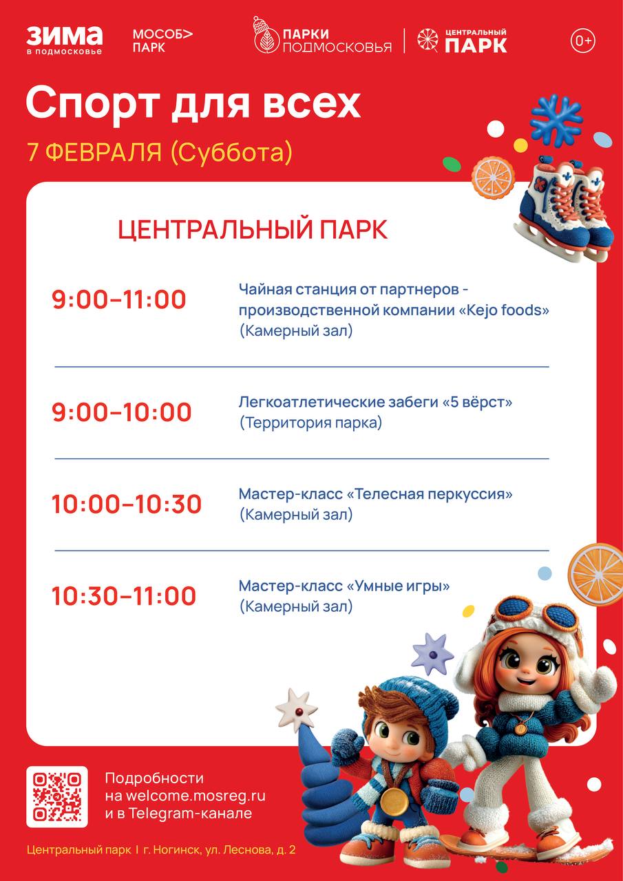 Суббота в Богородских парках будут посвящена спорту! В 9.00 в Центральном парке и в 13.30 в парке «Липовая аллея» стартует общеобластное мероприятие «Спорт для всех»! Тематические активности праздника не позволят участникам замёрзнуть даже при самом крепком морозе! (6+) В 11.00 в камерном зале Центрального парка пройдут занятия по нейрофитнесу (18+).