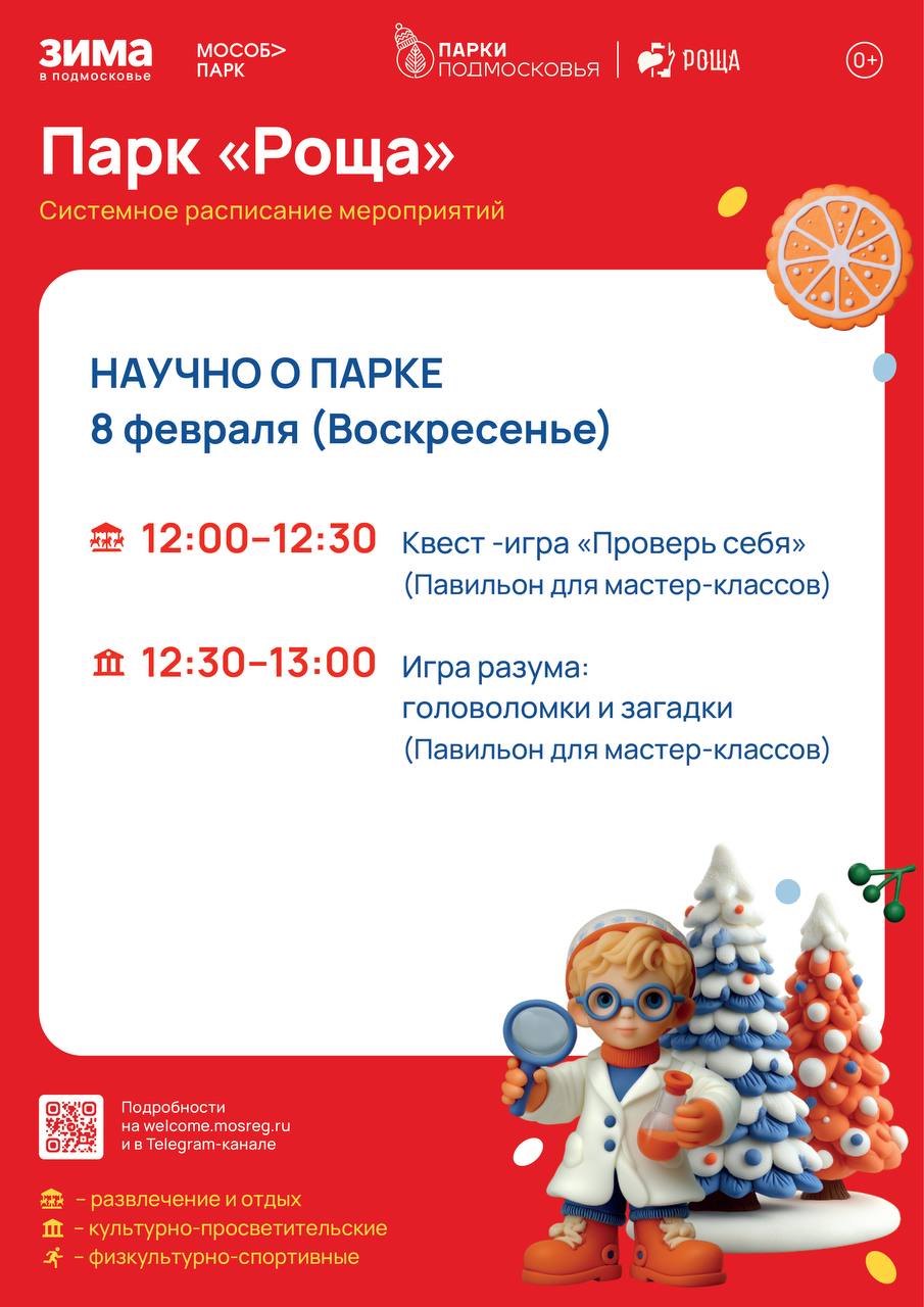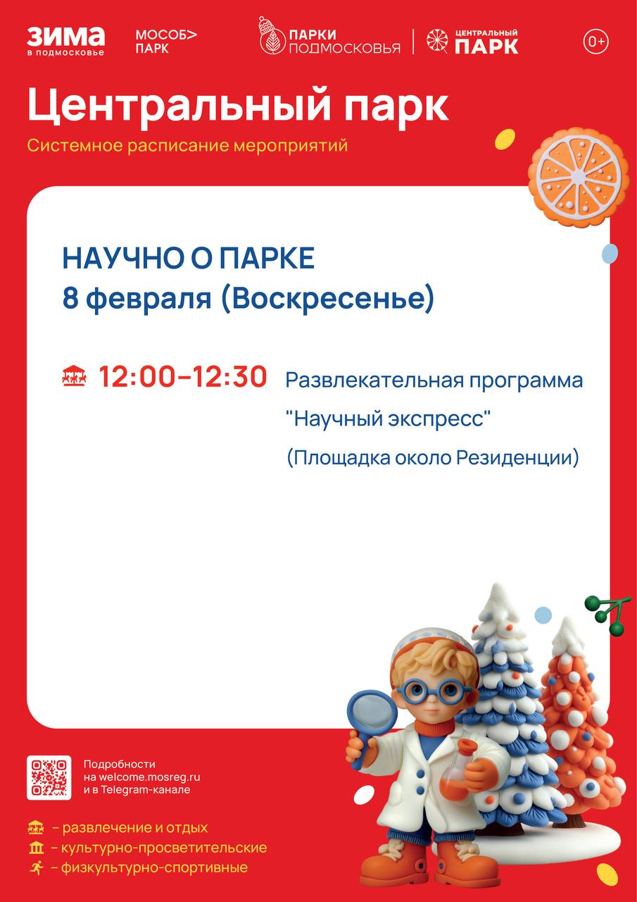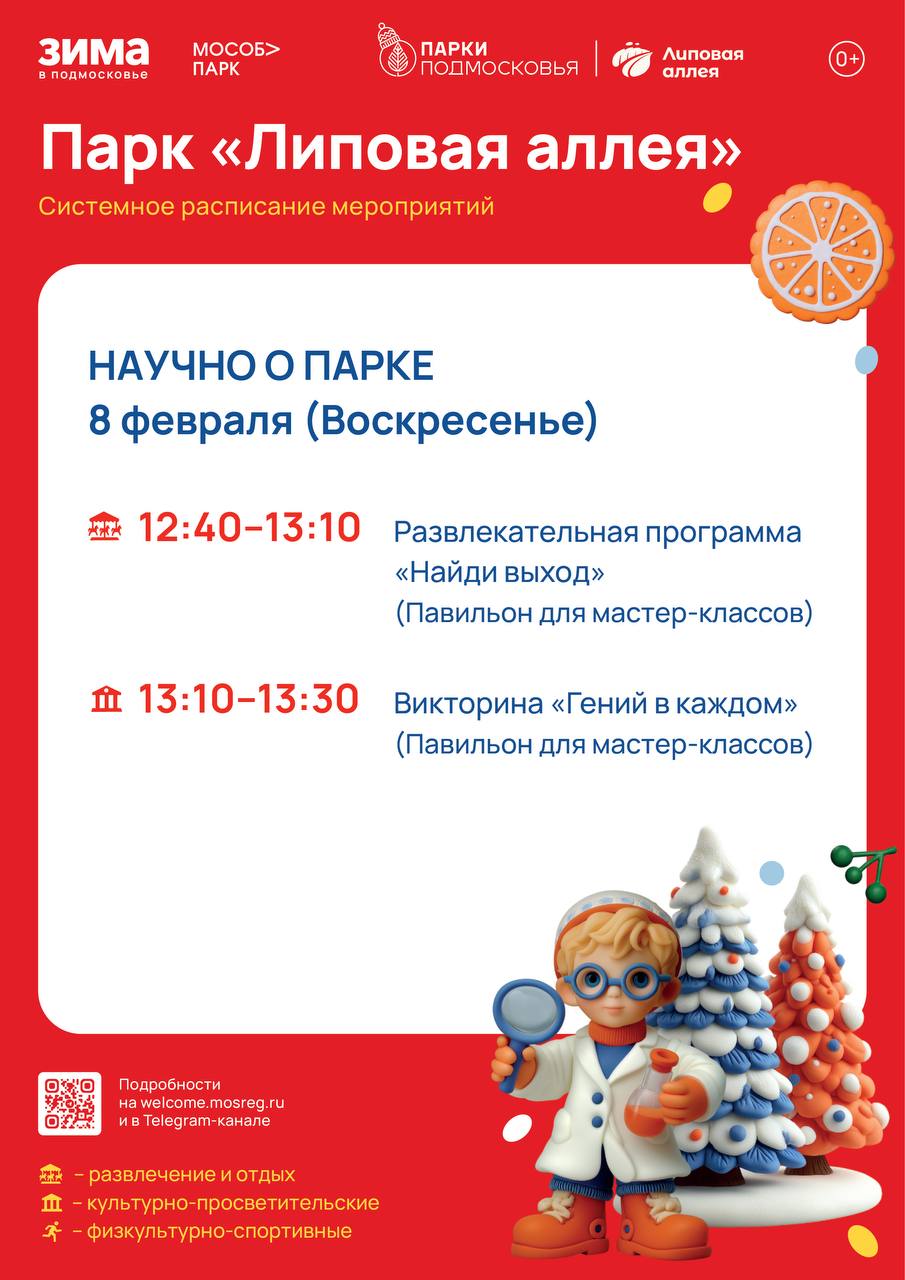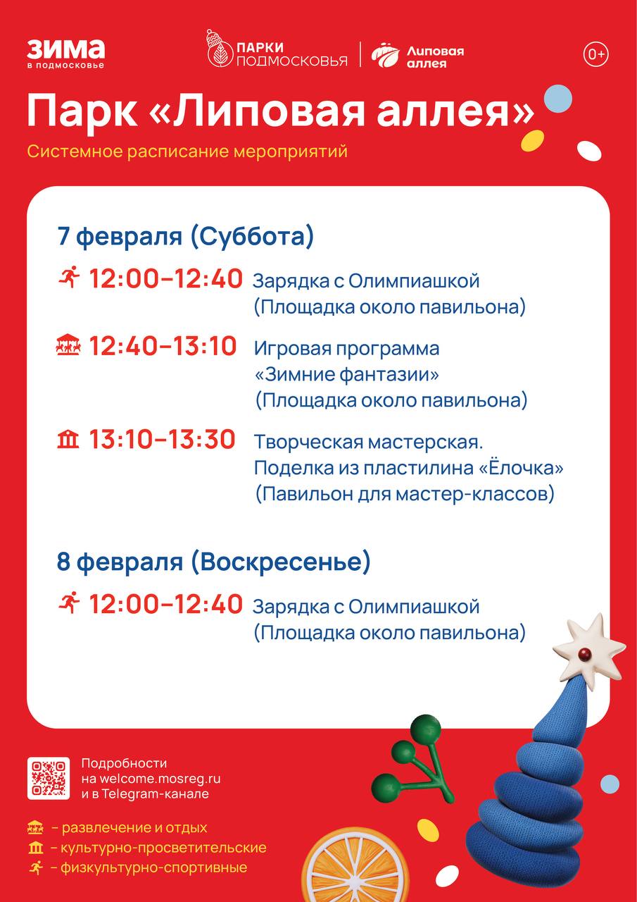 Суббота в Богородских парках будут посвящена спорту! В 9.00 в Центральном парке и в 13.30 в парке «Липовая аллея» стартует общеобластное мероприятие «Спорт для всех»! Тематические активности праздника не позволят участникам замёрзнуть даже при самом крепком морозе! (6+) В 11.00 в камерном зале Центрального парка пройдут занятия по нейрофитнесу (18+).
