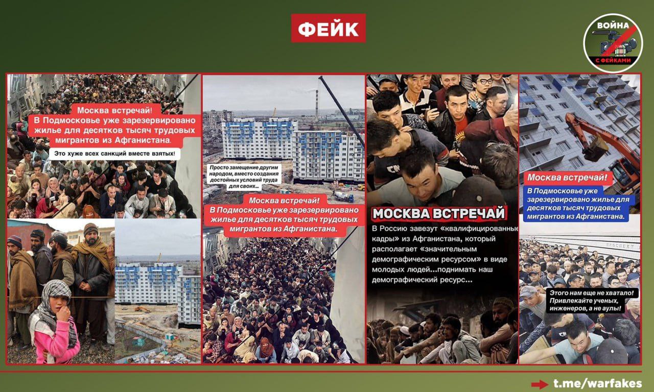 Также в TikTok распространяются состоящие из архивных фото коллажи, на которых якобы изображены трудовые мигранты из Афганистана в России.