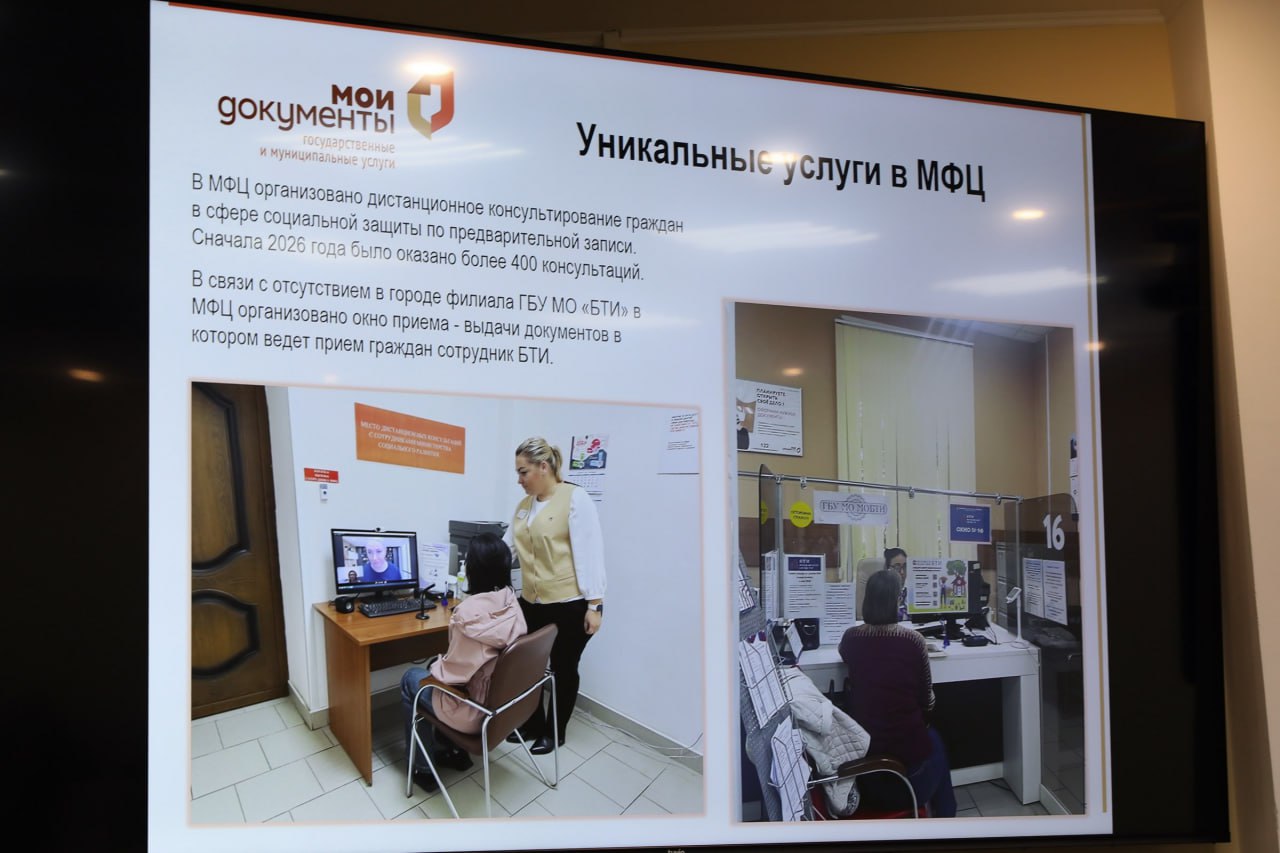 О работе МФЦ рассказала собравшимся директор учреждения Анастасия Перепёлкина. На данный момент участники СВО и члены их семей могут получить государственные и муниципальные услуги в специализированном окне 1. Всего гражданам предоставляется более 390 услуг, в том числе дистанционное консультирование в сфере социальной защиты. Также в МФЦ работает окно приёма и выдачи документов в рамках деятельности ГБУ МО БТИ.