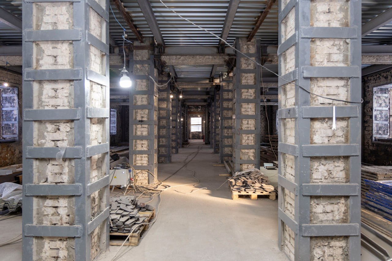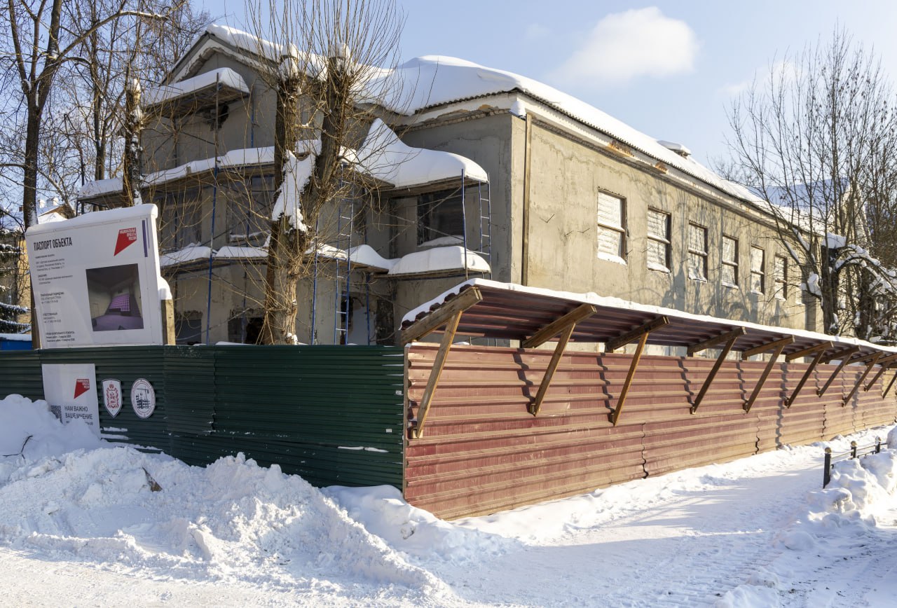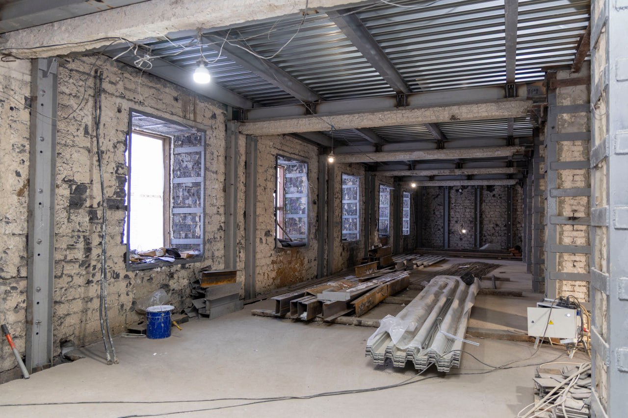 На данный момент на объекте проведены демонтажные работы, выполнено усиление фундамента и колонн, восстановлена пристройка, завершены работы по штукатурке фасада здания. Продолжаются работы по замене перекрытий и устройству оснований полов первого этажа.