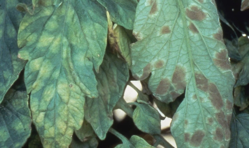 Кладоспориоз вызывается грибком и проявляется на листьях в виде сероватых, ворсистых пятен, особенно заметных на их нижней стороне. Пятна могут увеличиваться и сливаются, затрагивая значительные участки листа, которые затем высыхают и опадают. В результате этого листья становятся желтыми, хрупкими, и фотосинтез нарушается, что замедляет рост растений и снижает урожайность.