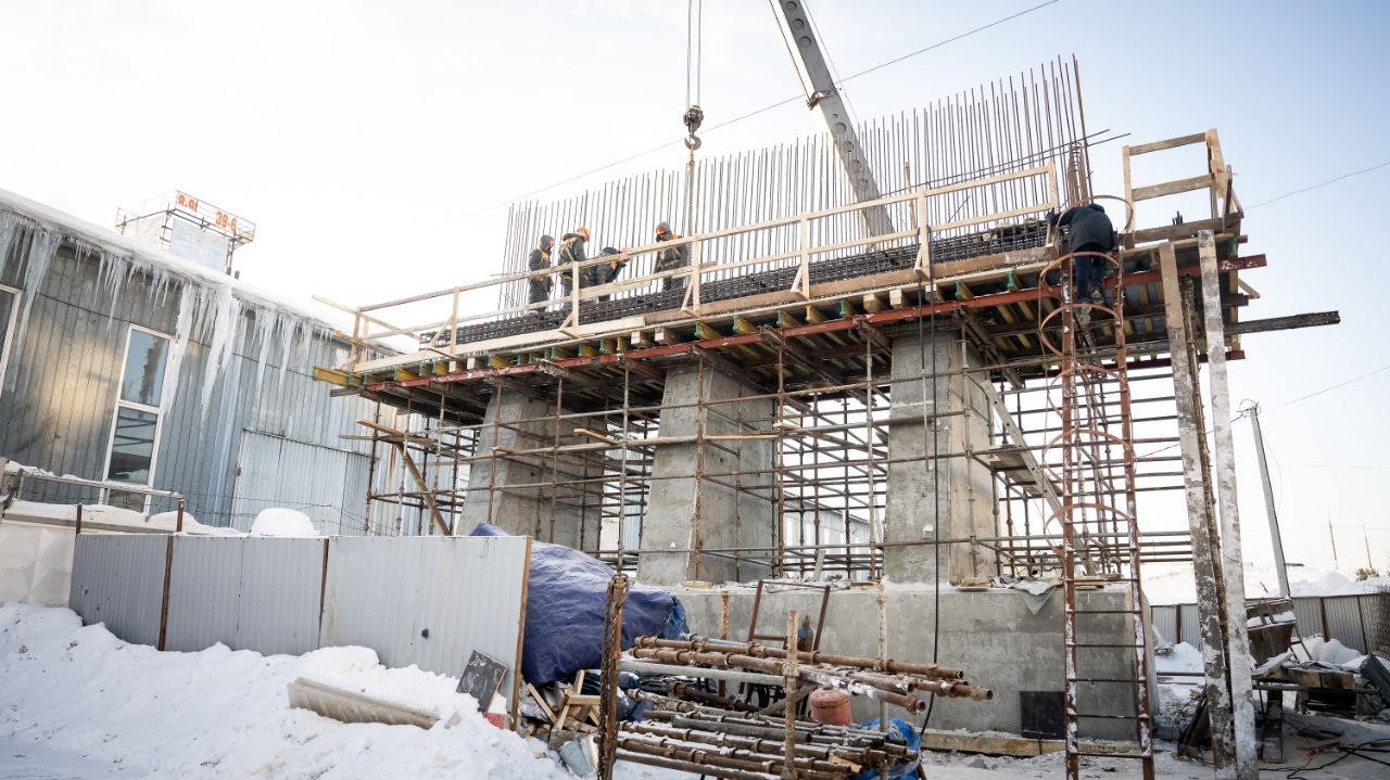 Строители работают в две смены, включая ночное время, чтобы ускорить темпы строительства.
